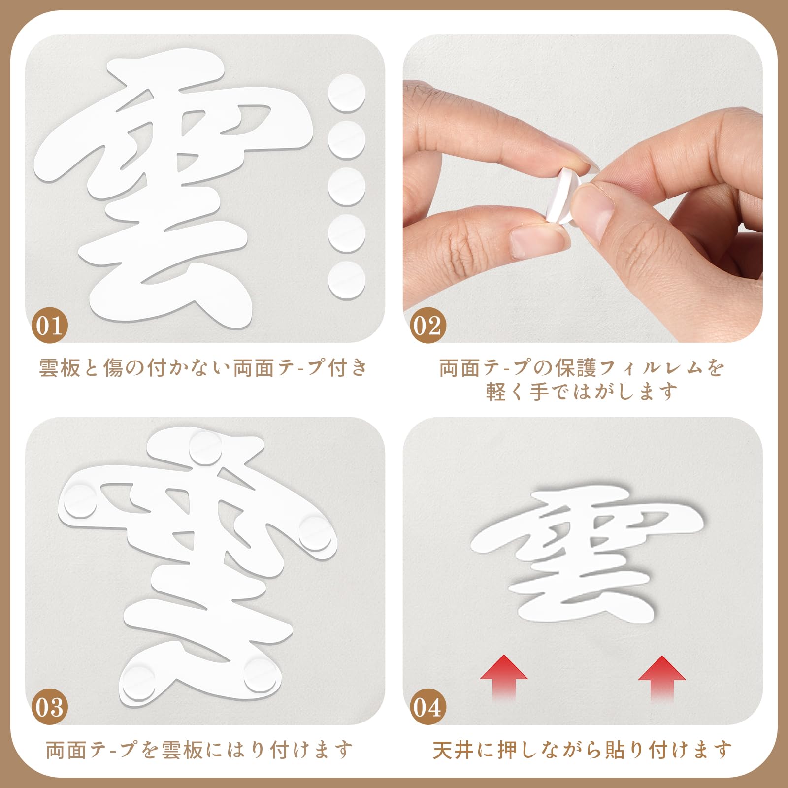 「雲 神棚の付属品」両面テープが付属しており、天井を傷つけたり汚したりすることなく簡単に貼り付けることができます。どのような神棚にも合わせやすく、賃貸住宅、マンション、店舗、和室、洋室など、さまざまな場所でご使用いただけます。