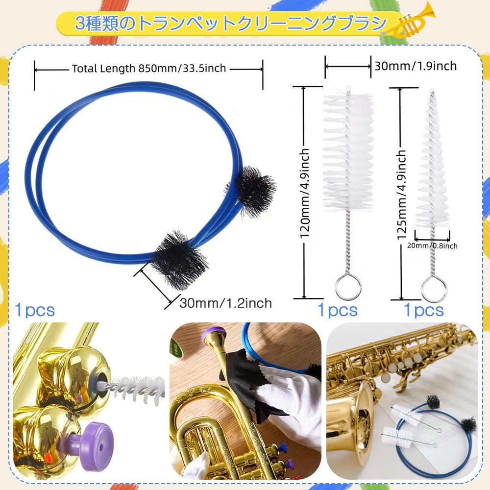 セット内容:トランペットクリーニングブラシには、3種類のブラシ、マウスピースの掃除のためのコーンフォーム、短いホースを掃除するためのドラム形状、長いホースを掃除するための青いブラシが含まれています。