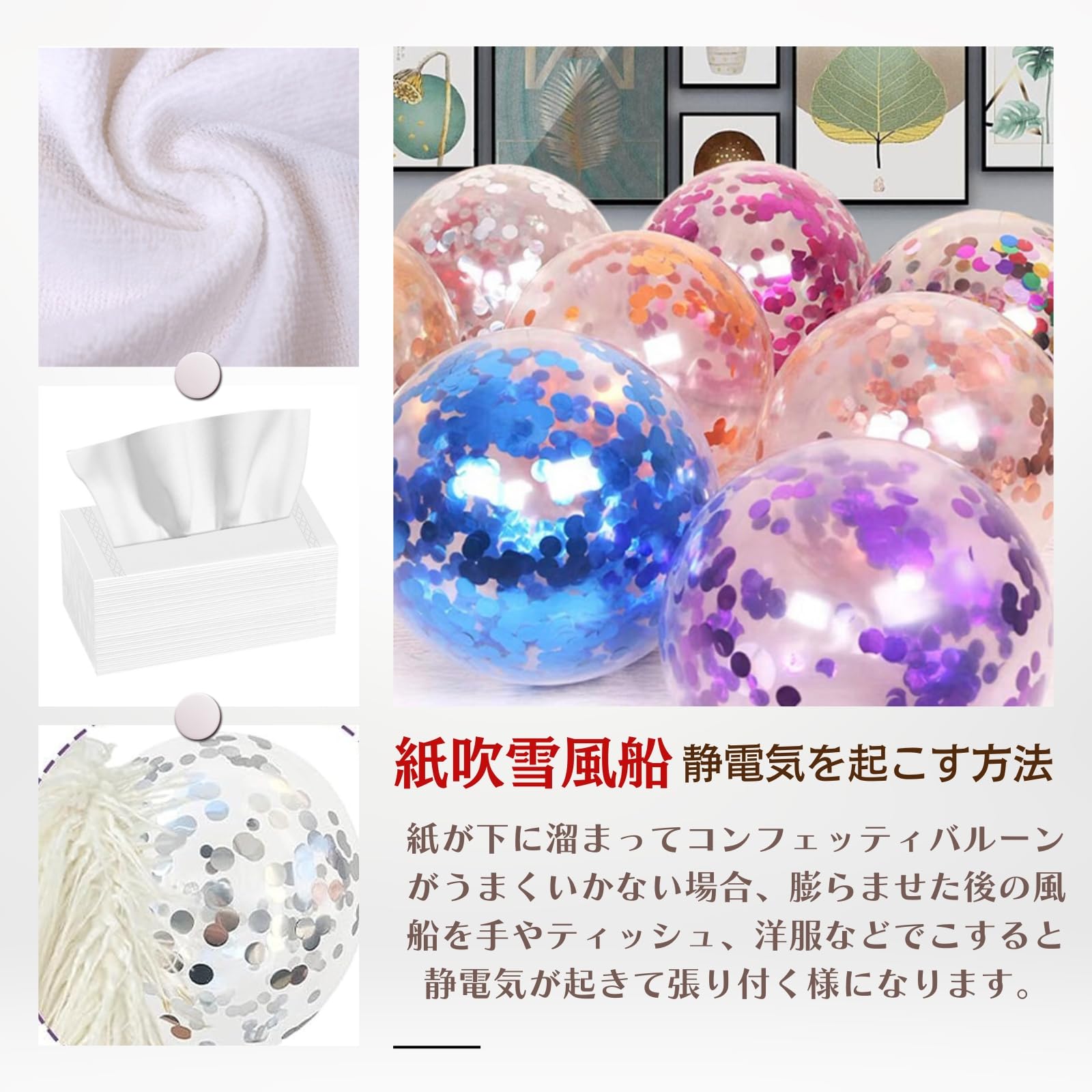??【膨らませやすい】このパーティーバルーンは空気やヘリウムで簡単に膨らませられます。膨らませた後、紙吹雪バルーンをティッシュや衣服で数回こすってください。そうすることで、内側にある紙吹雪がバルーン表面に付着し、より良い効果が得られます。1枚あたりの重さは3グラムで、通常のラテックスバルーンよりも明るい色合いで、20% 厚くなっています。