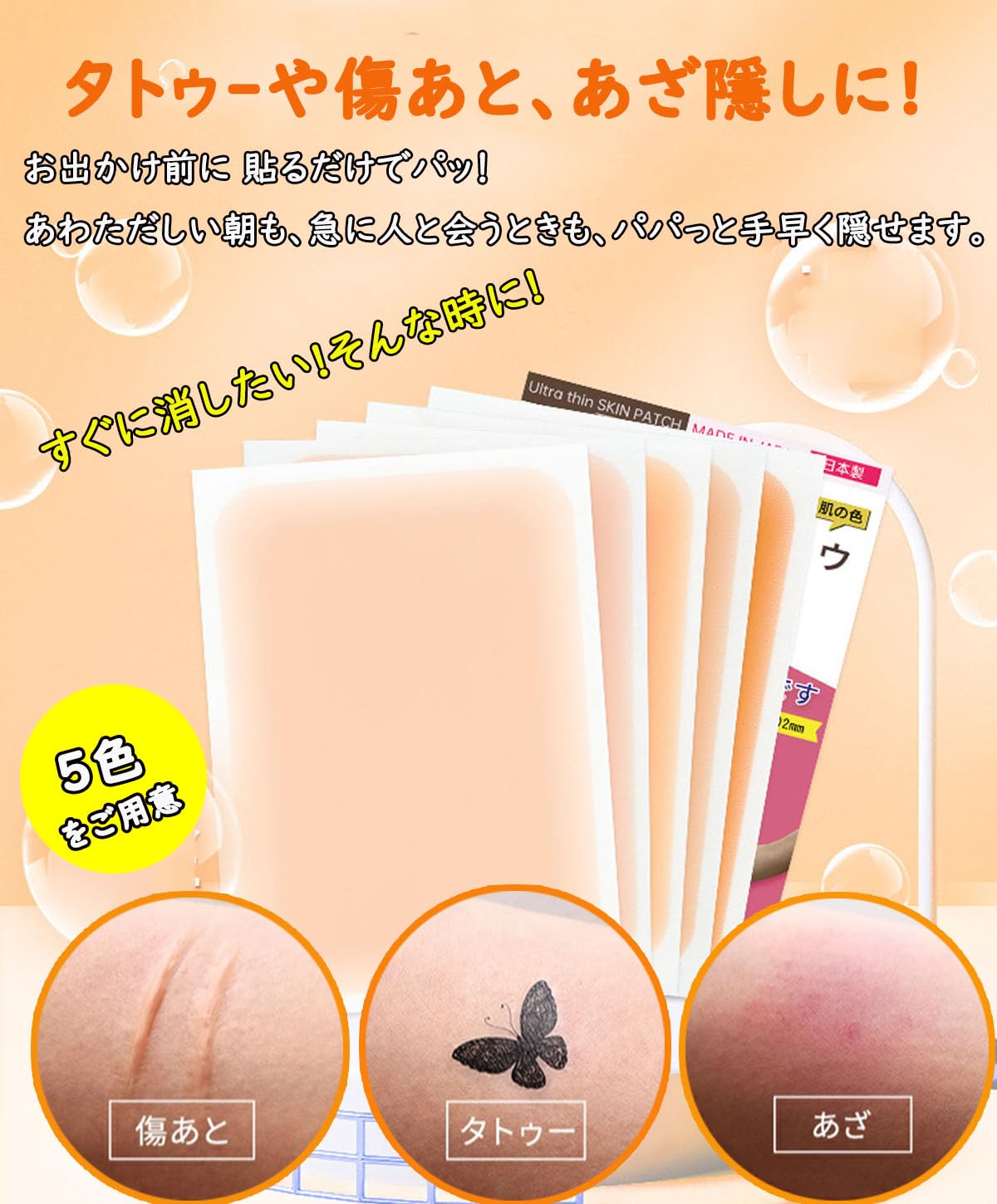 【使用性が広い】旅行、レジャー、ジム、プール、温泉などタトゥーやあざ、ほくろ、傷あとを簡単に隠せます。5〜7日貼り替え不要。肌色に合わせて選べる5色、ピッタリの色が見つかる!
