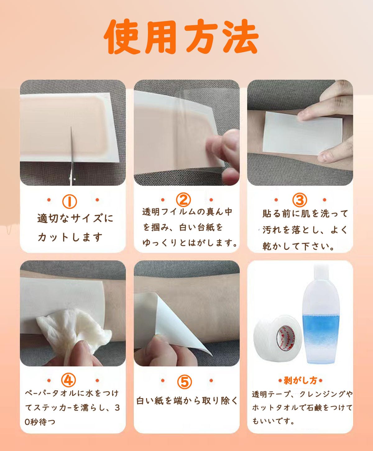 【貼り方】1.貼る前に貼りつけたい部分の肌をぬるま湯でよく洗い、汚れや油分を落とします。その後よく乾かし、水分を拭取ります。貼り付ける部分が汚れているとシールの粘着が弱くなり、?がれやすくなります。2.適切なサイズにカットしてから、離型シート(台紙)から上の透明保護フィルムと一緒に絵柄をゆっくりとめくります。3.貼る位置を決めたら、粘着面を肌の上に乗せ、丁寧にしっかりと揉んだり、擦ったりして圧着させます。4.肌にシールが付いていることを確認し、透明フィルムを端っこからゆっくりと剥がします。