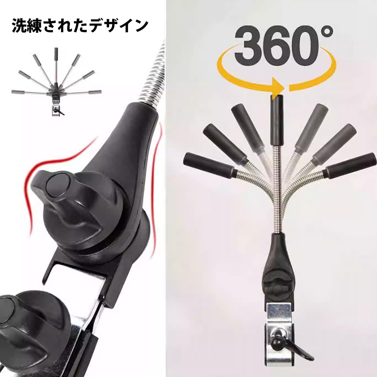 【取り付けが超簡単】他社のように傘柄を分解して取り付ける面倒な作業は一切不要で、ホルダーで傘の中棒を挟むだけで、5 秒でベビーカーに固定できます!また、万一傘が紛失しても心配ありません。