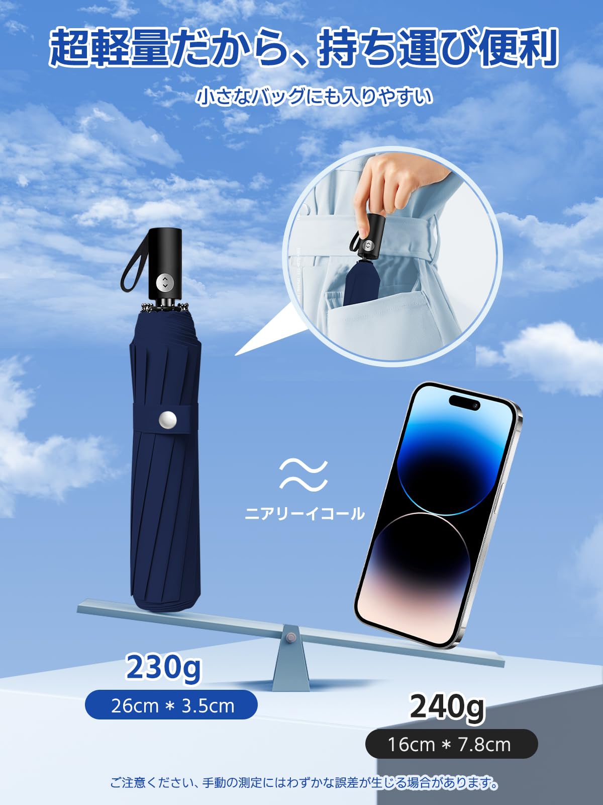 【一歩先行く!業界初安全式自動開閉】傘を閉じるのが難しい、またはちょっとした不注意で反発してしまうことがありますか?…新世代のALwgreenワンタッチ自動開閉折りたたみ傘がこれらの問題を全て解決しました。ALwgreen独自の安全式段階収納自動傘は、反発を防ぎながら段階的に収納し、省力60%!小学1年生のお子様でも簡単に扱えます。10万回の開閉テストをクリアし、耐久性を大幅に向上させ、最長10年間ご使用いただけます。