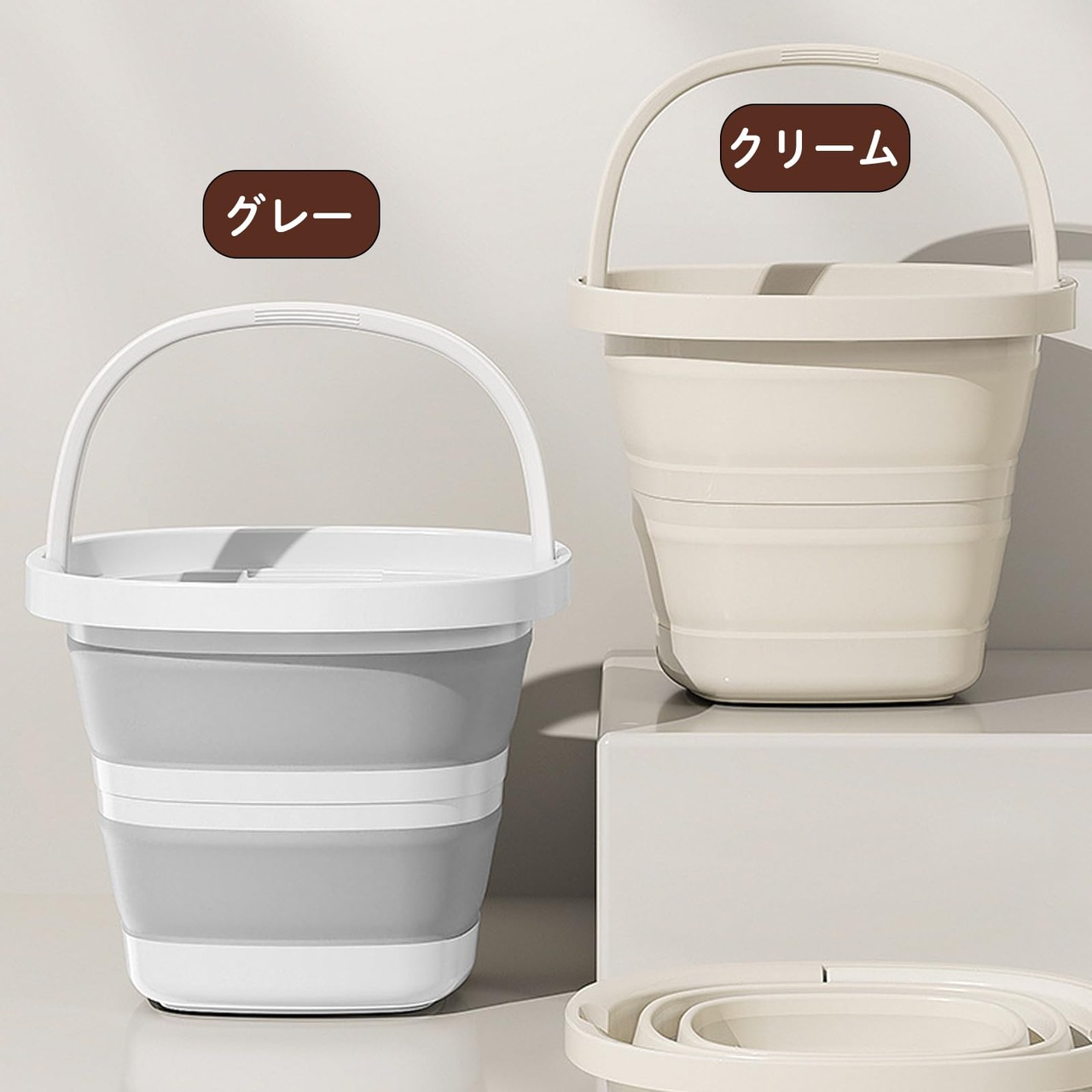 【サイズ】5リットルタイプ 直径26cm×高さ19.5cm 折りたたんだ高さ4.5cm 10リットルタイプ 直径33cm×高さ24cm 折りたたんだ高さ5.5cm シンプルな北欧風デザイン。