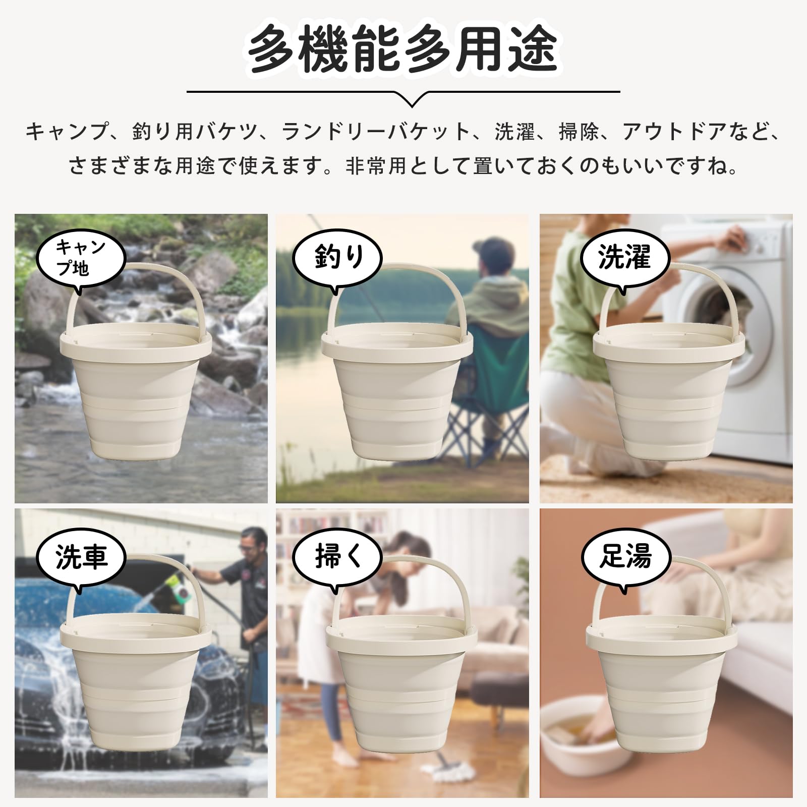 【幅広いシーンで活躍】折りたためるバケツは掃除、洗濯、ガーデニング、洗車など幅広いシーンで活躍します。また荷物を最小限にしたいキャンプやツーリング、釣りなどのアウトドアにも最適です。