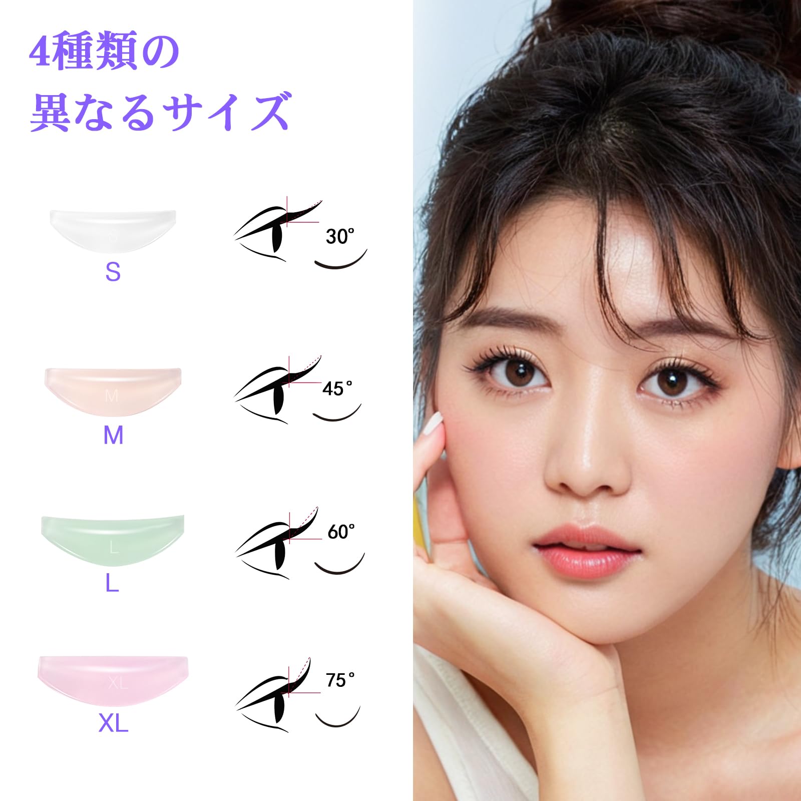 4種類のサイズ:S/M/ L/XL、まつげのカール角度を細かく調整可能。カール角度が30度から75度まで選べるので、好みの仕上がりを簡単に実現できる