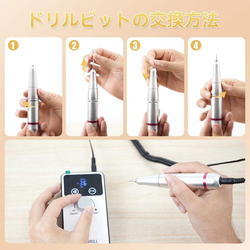 【多機能プロ用電動ネイルマシン】: ネイルマシン プロ用6種類の異なる効果を持つ研磨ヘッドが付属しており、それぞれ異なる用途に使用できます。ジェルの研磨・除去、修復、ネイルケア、爪表面の凹凸修整、ドライスキン処理、角質除去、ネイル整形、ネイルポリッシュなどに使用できます。研磨ヘッドの交換は簡単で迅速、初心者でもすぐに使いこなせます