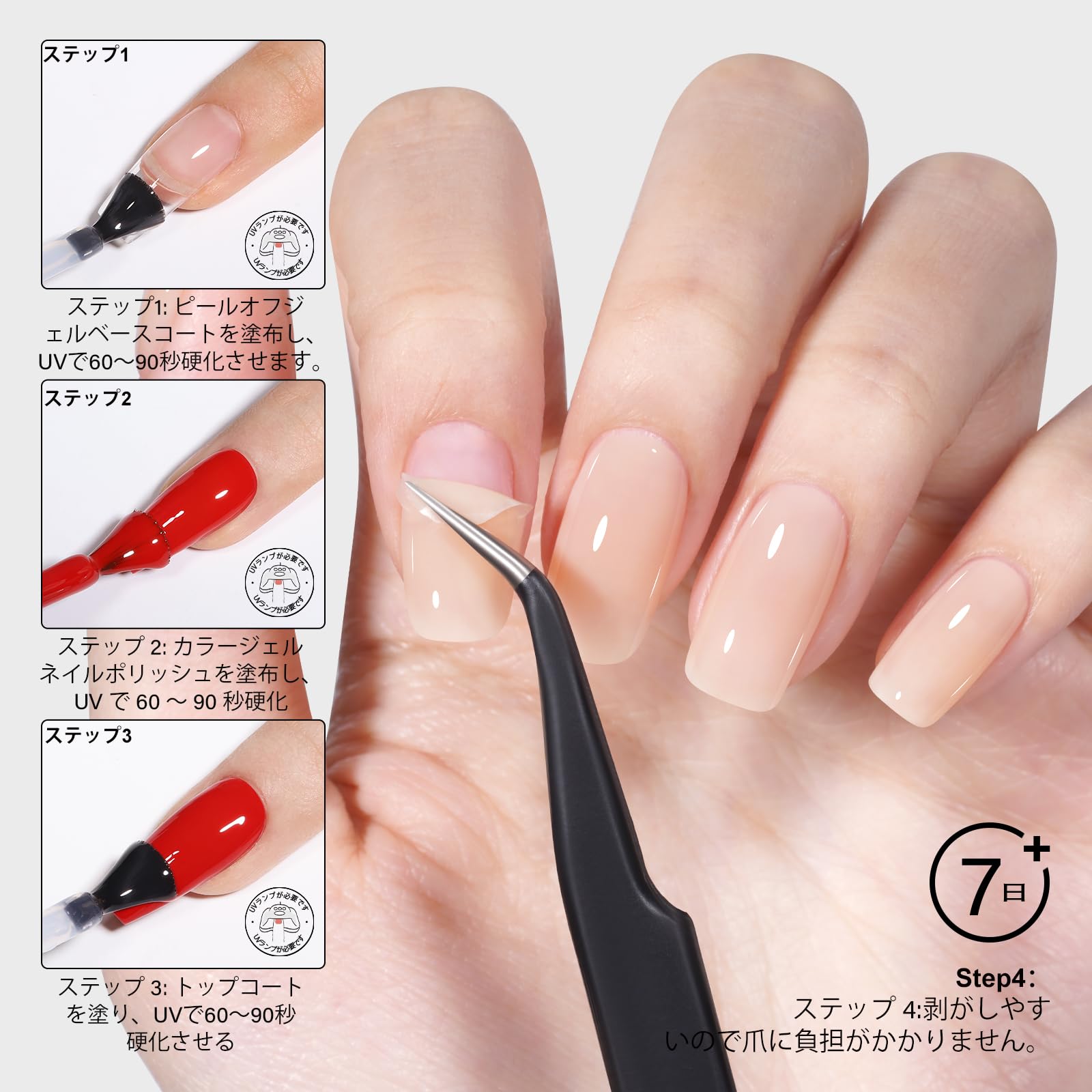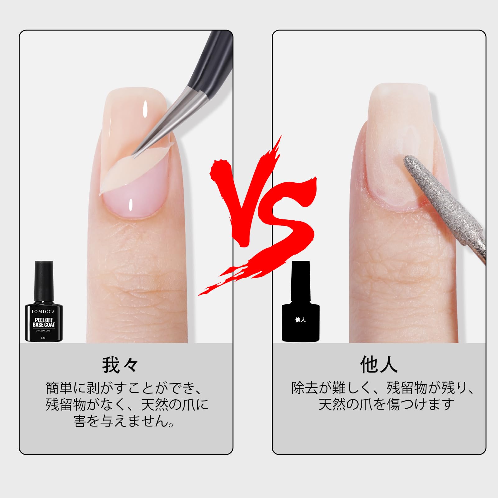 TOMICCA剥がせるベースジェルは無臭であり天然樹脂,刺激臭がない,9つの有害物質を含まず、ビーガンでクルエルティフリーで、快適なマニキュア体験を提供します。剥がせるジェルネイル ベースを使用すると、リムーバー不要。
