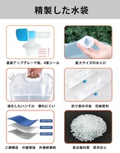 【サイズ&素材】:セット内容 折りたたみ水袋(15 L)X2個、蛇口(最新アップグレード版)X2個、マジックテープX2個;サイズ:約48cm x 42cm(たたんだ時:約43cmx 18 cm、蛇口付き),重量:約120g X2個;素材:高品質PE、三層構造。