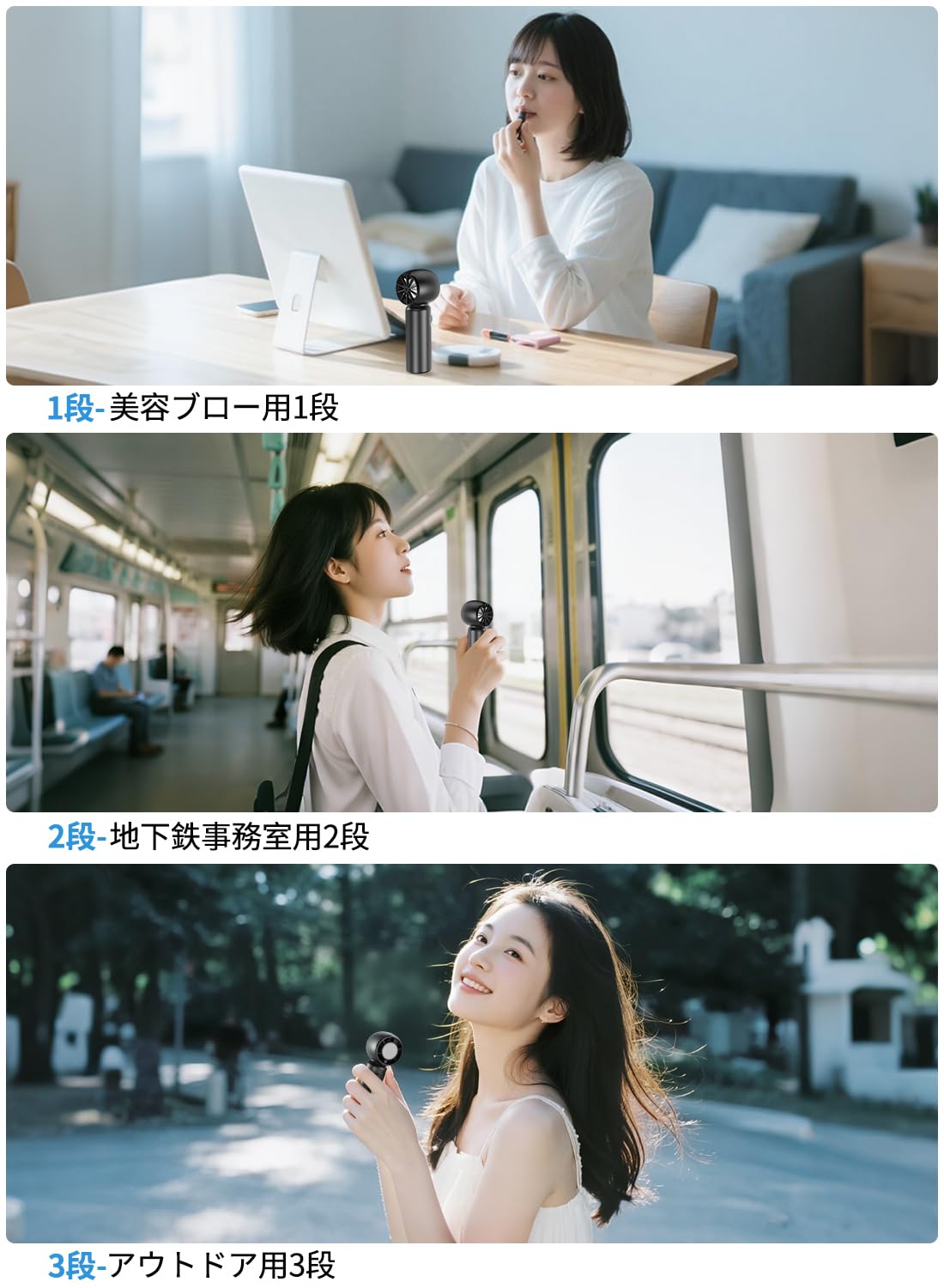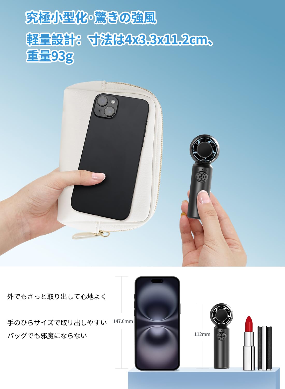 【コンパクトで軽くて、持ち運びやすい】 寸法は4x3.3x11.2cmで、わずか93gの重さ。女性や子供たちにも軽々と握れ、持ち運びがやすい手持ち扇風機です。手のひらサイズ、軽量設計で、外出や通勤・旅行にも最適、真夏の出かけはこれが欠かせないです。