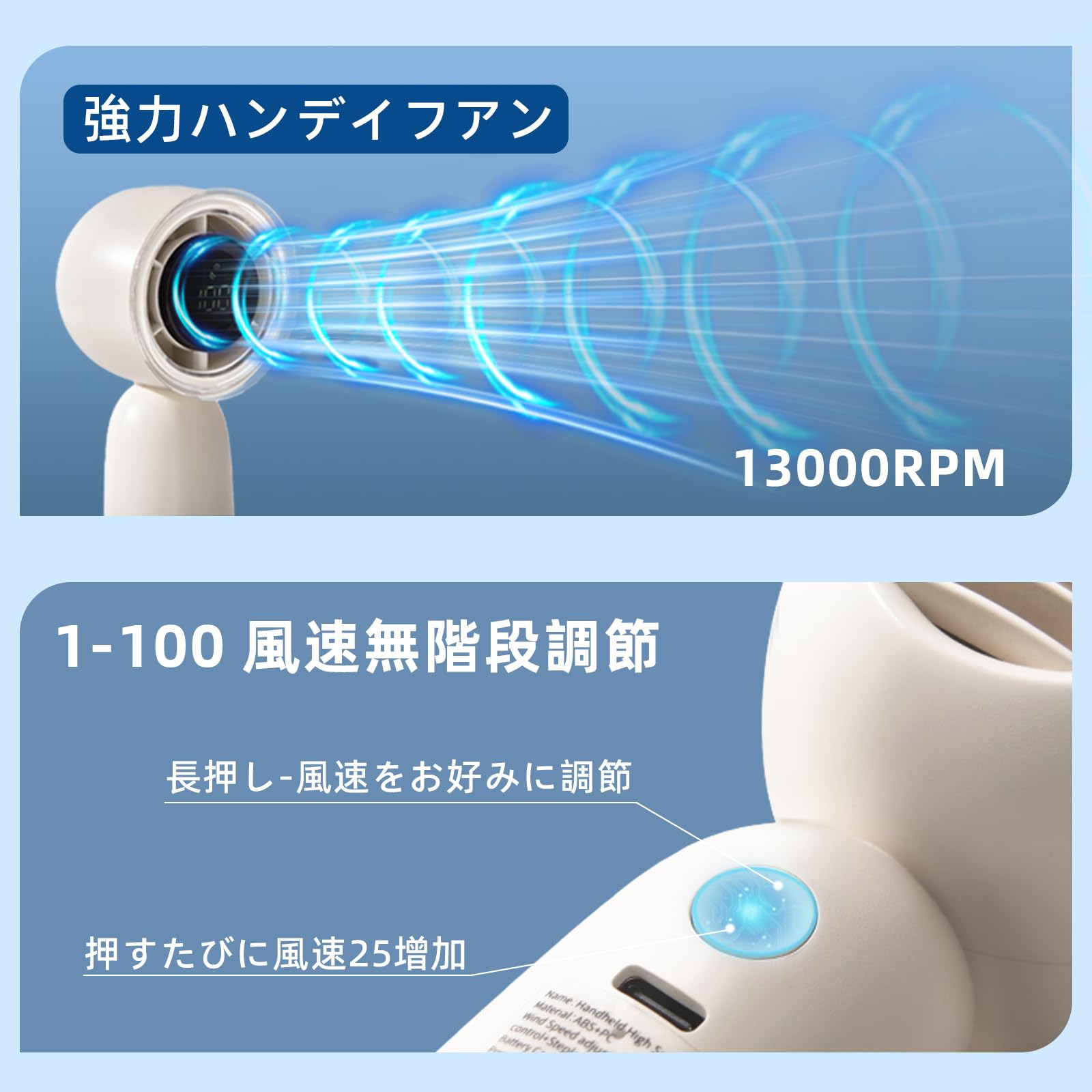 【100段階風速調整】:このハンディファンは風速調整が可能なミニ扇風機です。2種類の調整方法:ワンタップで風速を変更:微風から強風まで4段階(25-50-75-100)の風速設定が可能です。長押しで無段階に風速を調整できます。