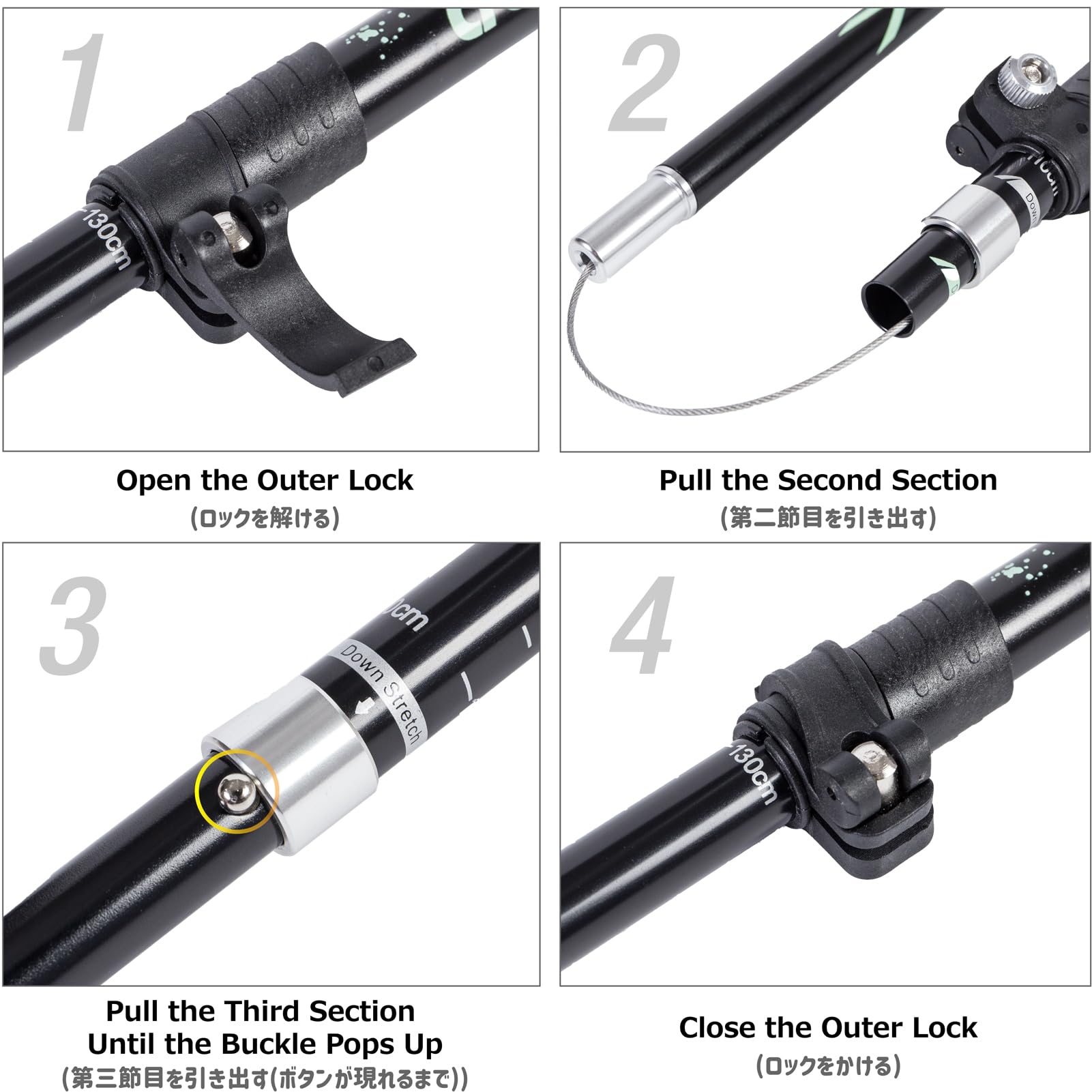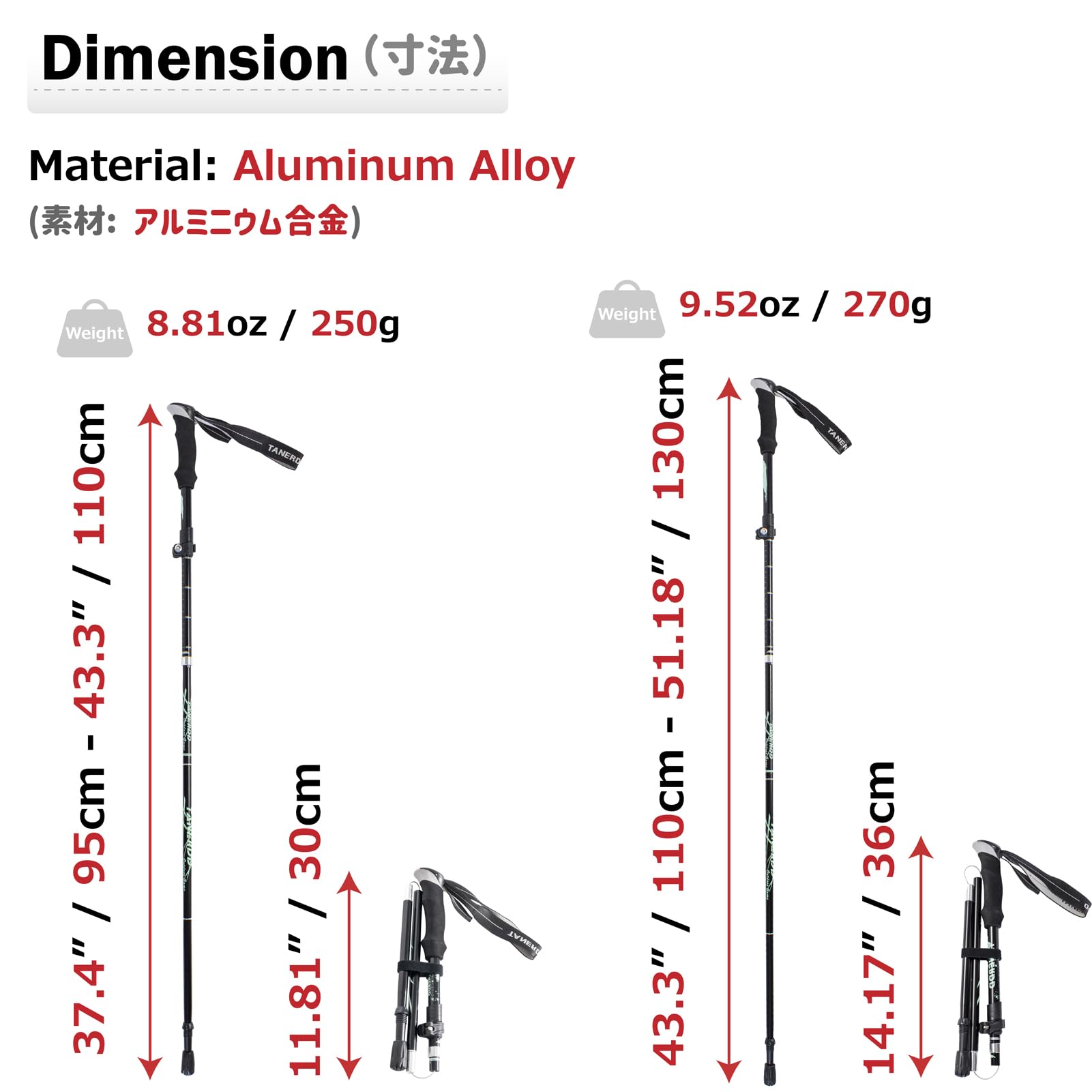 ?【130cmのトレッキングポール】全長130cm、長さ調整可能(110cm - 130cm)、重量270g、収納サイズ:36cm、対応身長:170cm~190cm