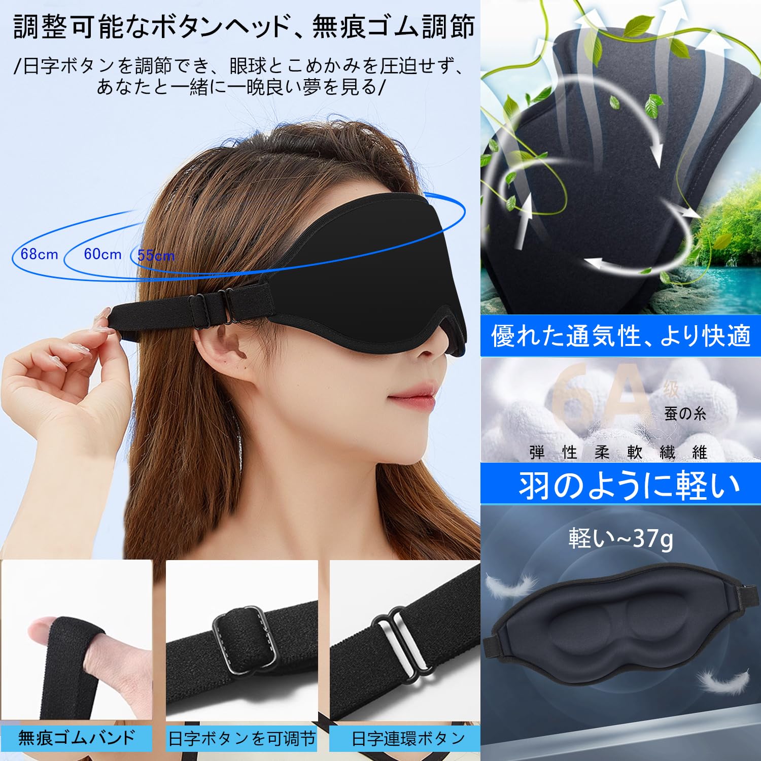 【業界新無圧遮光構造】 アイマスク 耳栓 遮光率99.99% 安眠 快眠 軽量 3D 立体 自由調整可能 洗濯可能 睡眠用 夏/冬用 男女兼用 収納袋(ブラック)
