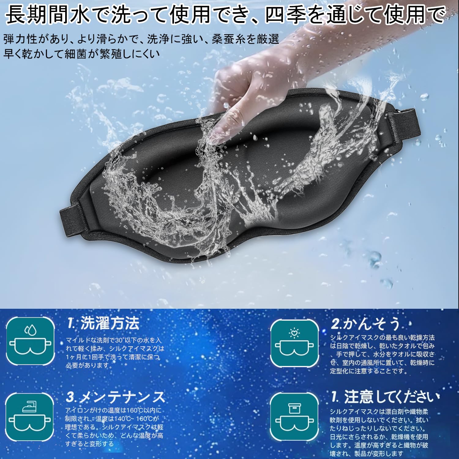 ??【 ふんわり素材、通気性抜群・洗濯可能】ふんわりした素材で圧迫感がなく。一般的な睡眠用アイマスクよりも柔らかく、通気性に優れています。寝ている間も快適にご利用いただけます。春夏秋冬のオールシーズンに対応!手洗いのできるウォッシャブル素材なので、清潔さを簡単に保つことができます。提案します:マイルドな洗剤で30°以下の水を入れて軽く揉み。脱水するときは、眼罩をねじったり、折りたたんだりしないようにご注意ください。