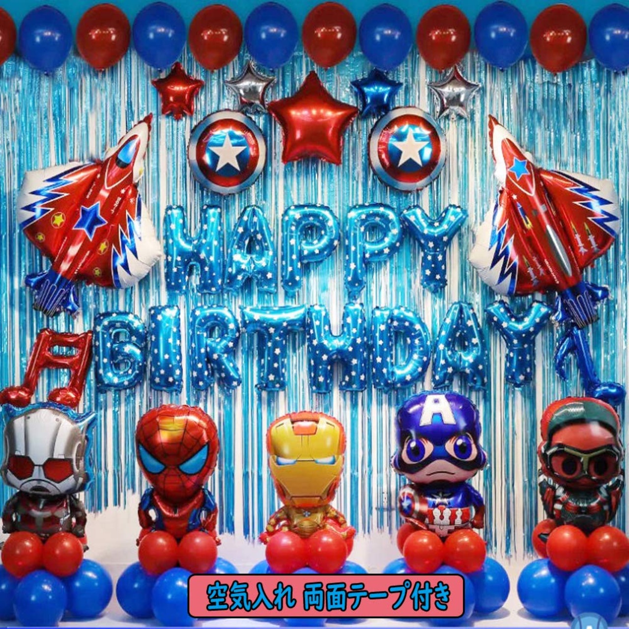 【超豪華なセット】①HAPPY BIRTHDAYバルーン×1セット ②スーパーヒーロー×5 ③ロケット×2 ④盾×2 ⑤18インチ五角星×1 ⑥10インチ五角星×4 ⑦レッドバルーン×20 ⑧ブルーバルーン×20 ⑨レインカーテン×3パック ⑩空気入れ×1 ⑪両面テープ×1