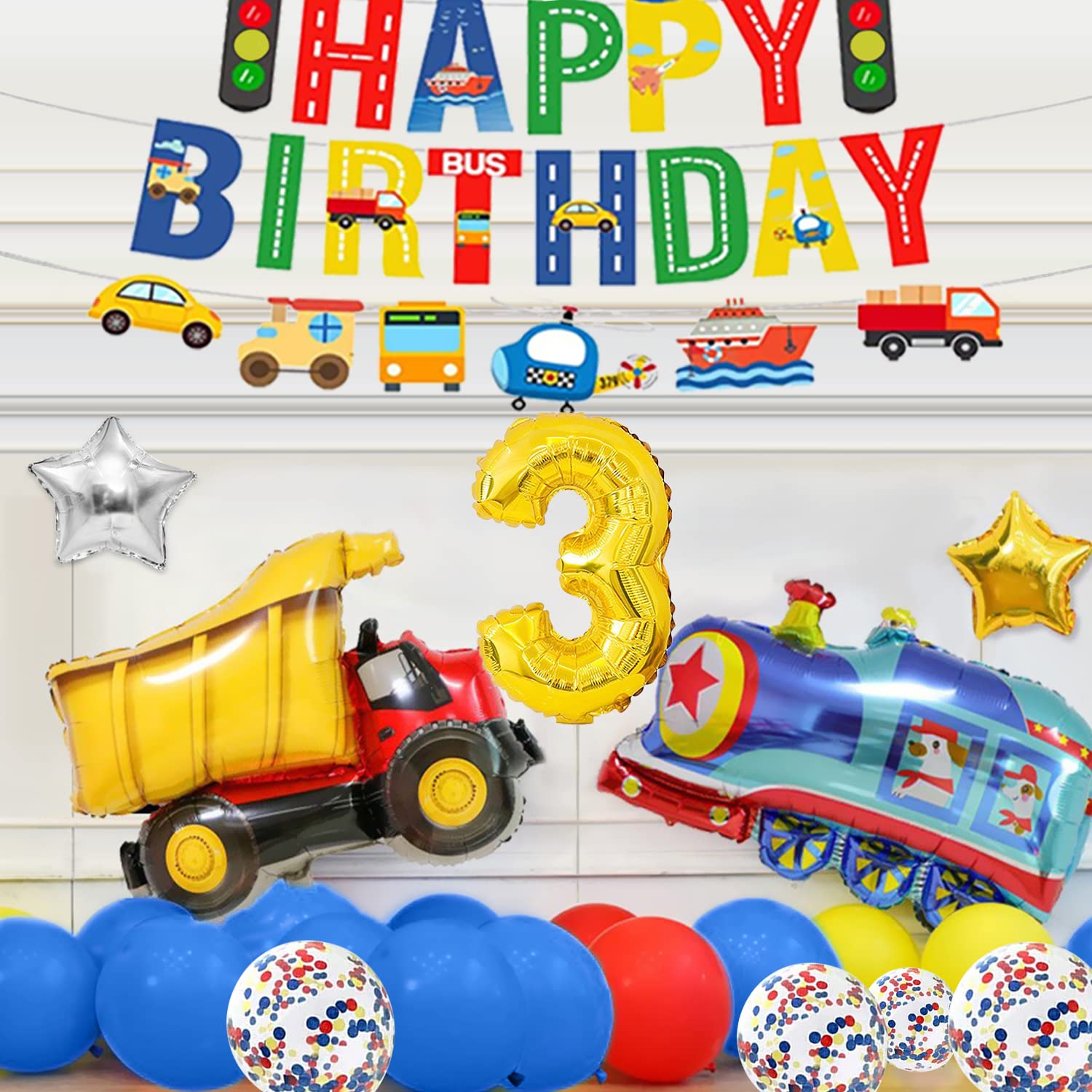 【商品セット内容】①90CM数字3バルーンx1 ②25.4cmゴム風船x36(赤色、青色、黄色、紙吹雪風船各9個) ③アルミ風船x6( 警察車両*1、列車*1、バスヨット*1、消防車*1、トラック*1、救急車*1 ) ④ゴールド五芒星バルーンx1 ⑤シルバーの五芒星バルーンx1 ⑥「HAPPY BIRTHDAY」バナーx1 ⑦小道具キット(リボンひも、両面テープ、バルーンチェーン) 男の子が大好きな車主題の誕生日飾り付けセット、3歳の男の子の誕生日プレゼントに人気です。