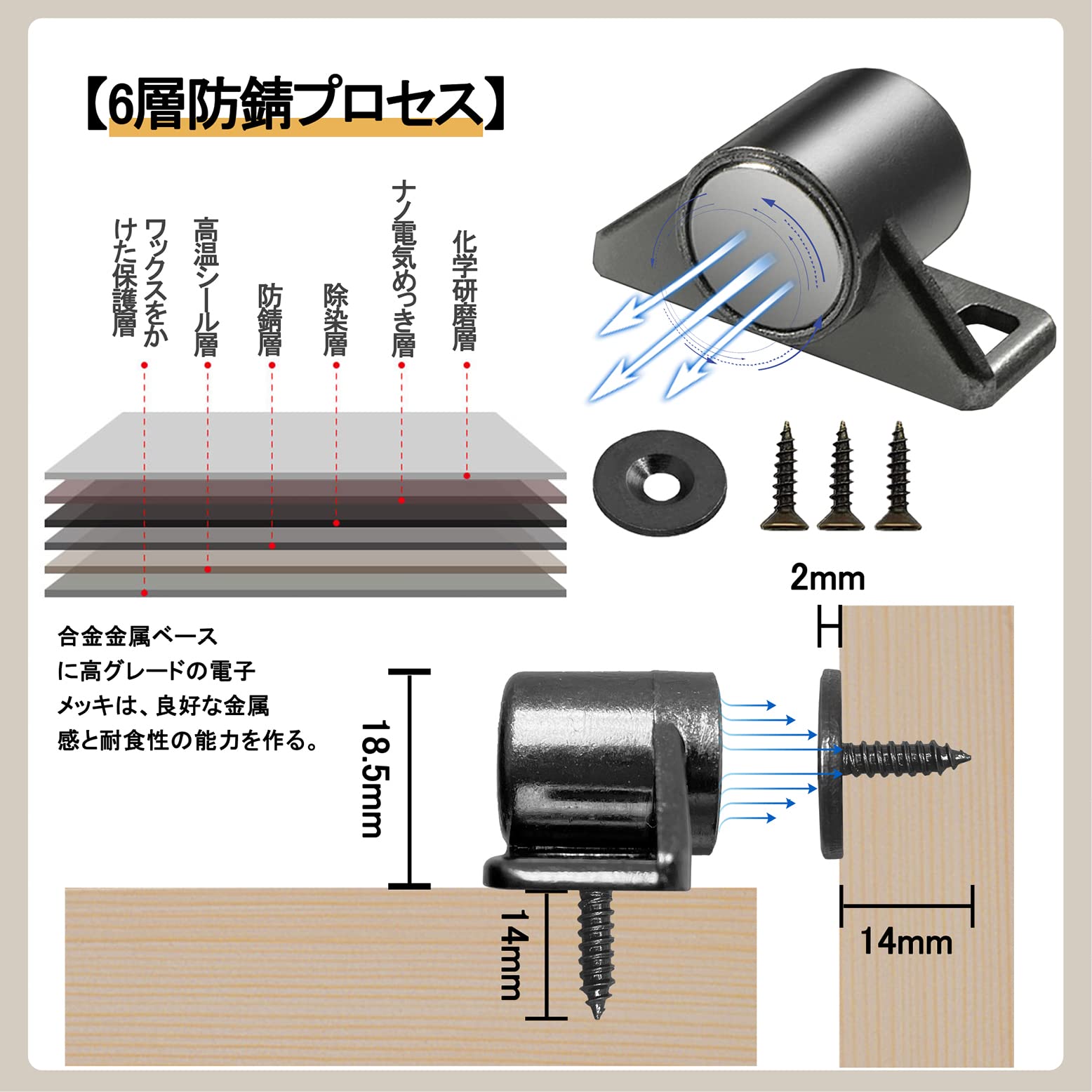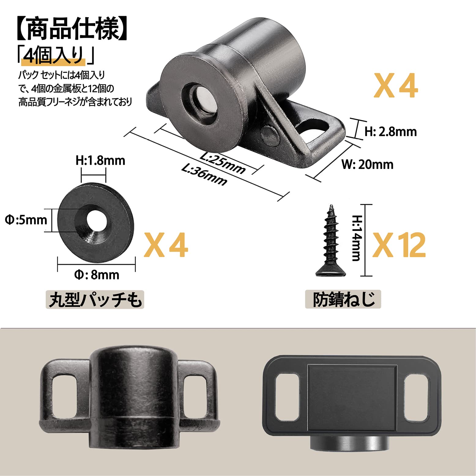 ??【高品質の素材】のドア マグネット キャッチは高品質の亜鉛合金で作られ、高級電子メッキが施されており、非常に丈夫で耐久性がある。防錆、耐腐食性、耐摩耗性に優れ、割れにくい。コンパクトで美しいデザインです。体積が小さくて、空間を占めないで、使いやすいです。