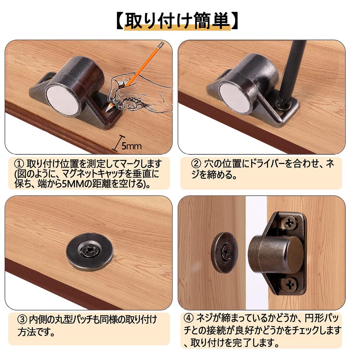 ??【取り付け簡単】穴あけ箇所は明らかで操作に有利である。マグネット キャッチの取り付け穴は長円形で位置調整がしやすく、接続性も良好です。ネジ穴を微調整することでマグネットの大きさを前後に調節することもできる。まずはインストールの位置を決めて、マークをつけます。次にドライバーで穴を合わせ、ネジを締めます。そして内側の円形シールも同様の方法で取り付けます。最後にインストールが適切かどうかを確認すればい。