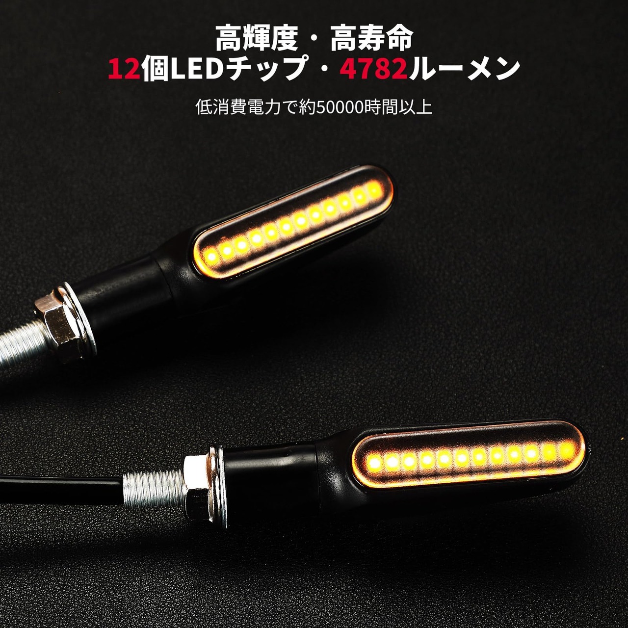 【キラキラ ・ 高輝度】流れるウィンカーは12個の高功率LEDチップを内蔵し、明るさは4782ルーメンで、市販のバイク ウインカーの3倍の明るさを実現した。昼間でも夜間でも超強力な警告効果を提供します。高輝度で走行安全性を向上させ、バイクをさらにクールに見せます。