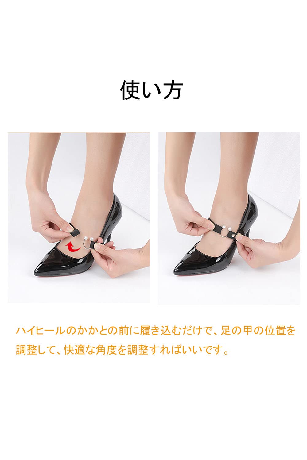 【取り付け簡単】ハイヒールのかかとの前に履き込むだけで、足の甲の位置を調整して、快適な角度を調整すればいいです。