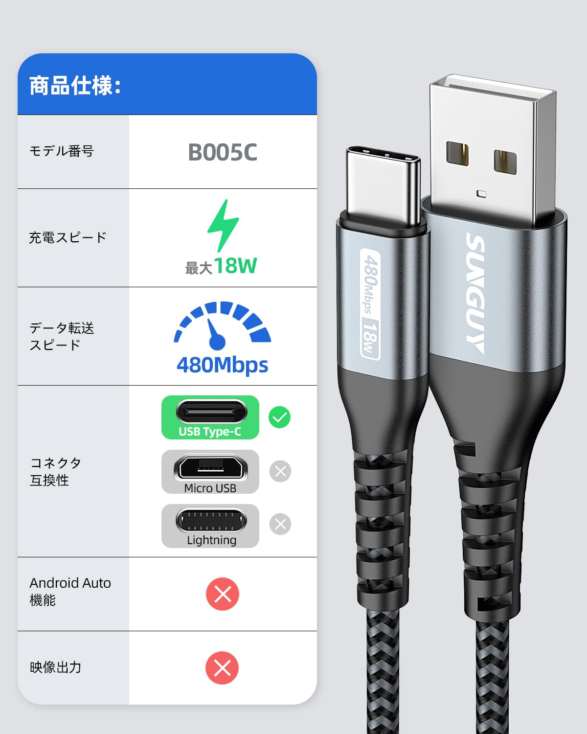?【18W高速充電&データ転送】この usb a to c ケーブル は3Aシームレスエンドチップ(56kプルアップ抵抗)を備えたUSB-Cケーブルです。高速充電とデータ転送を同期でき、USB2.0最大480Mbpsでデータ転送を可能です。QC3.0/2.0最大18W(5V/2A、9V/2A、12/1.5Aなど)急速充電に対応できます。??ご注意:iPhone15シリーズの急速充電は、このケーブルでは一時的にサポートされません。