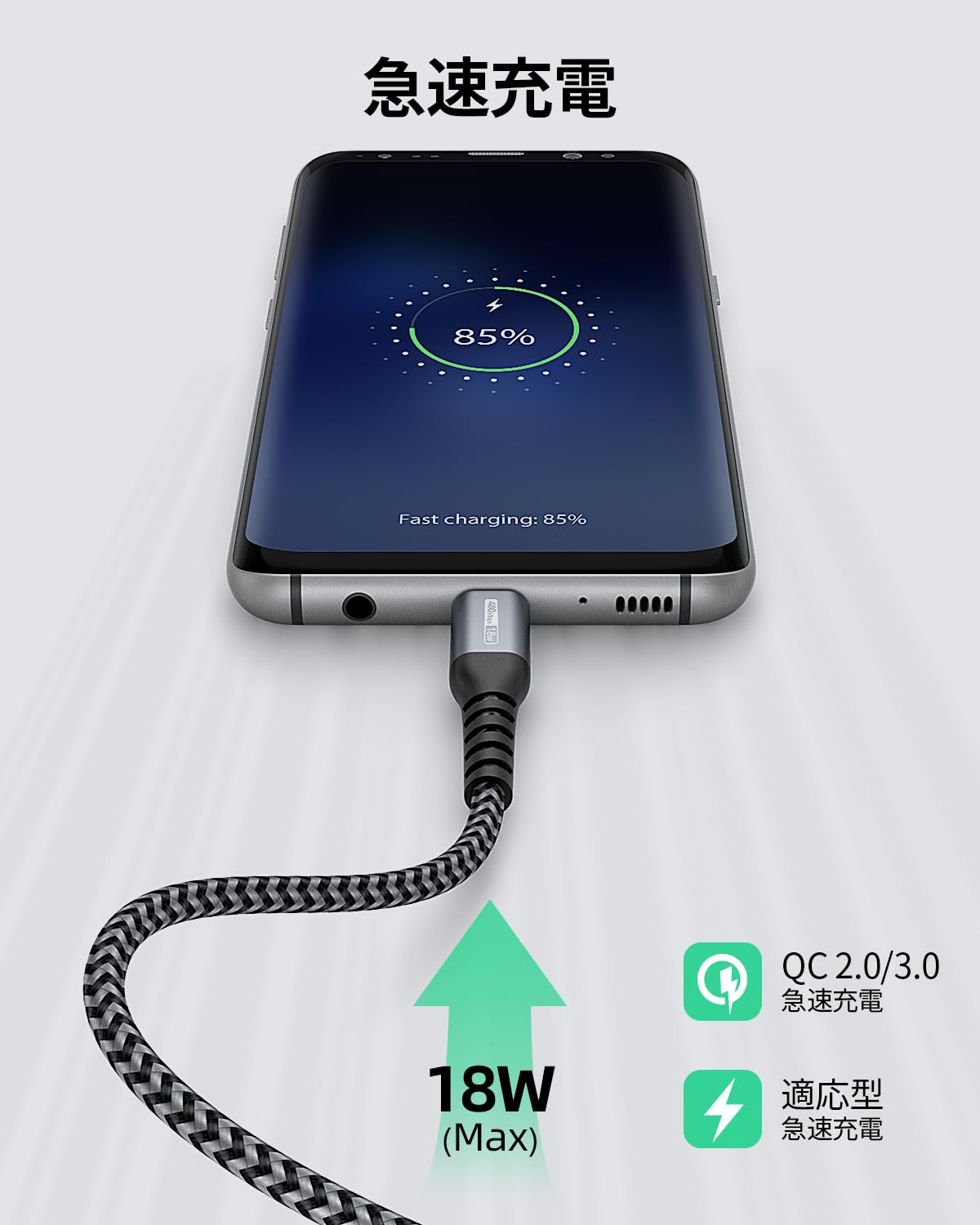 ?【 アルミカバー】usb c ケーブルの両端(手で持つ部分)はアルミ製カバーを採用しております。 プラスチック製のグリップよりも外れにくい、長時間の充電しでも優れた放熱性を発揮します。
