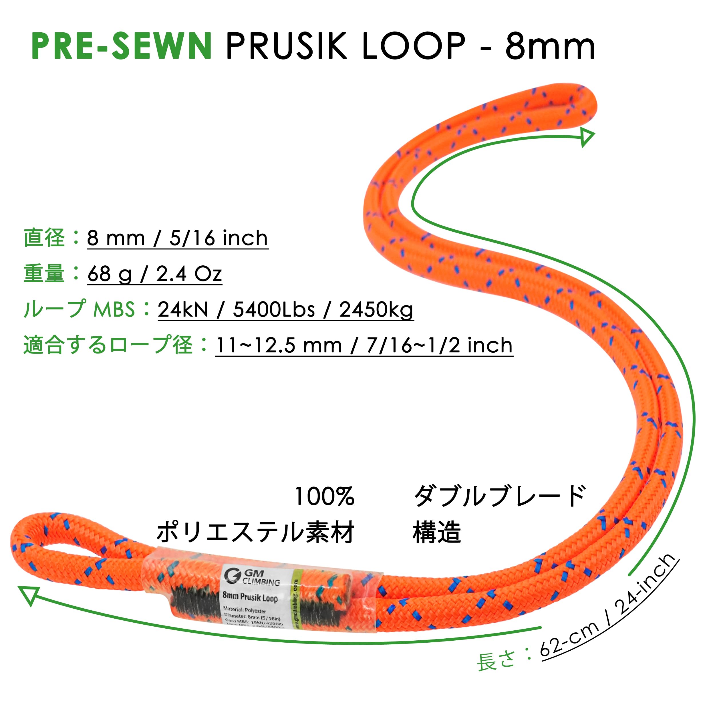 GM CLIMBING ダブルブレード 8mm プルージックループ プルージックループコード クライミング アーボリスト ツリー クライミング 46CM / 62CM 長さは調整可能