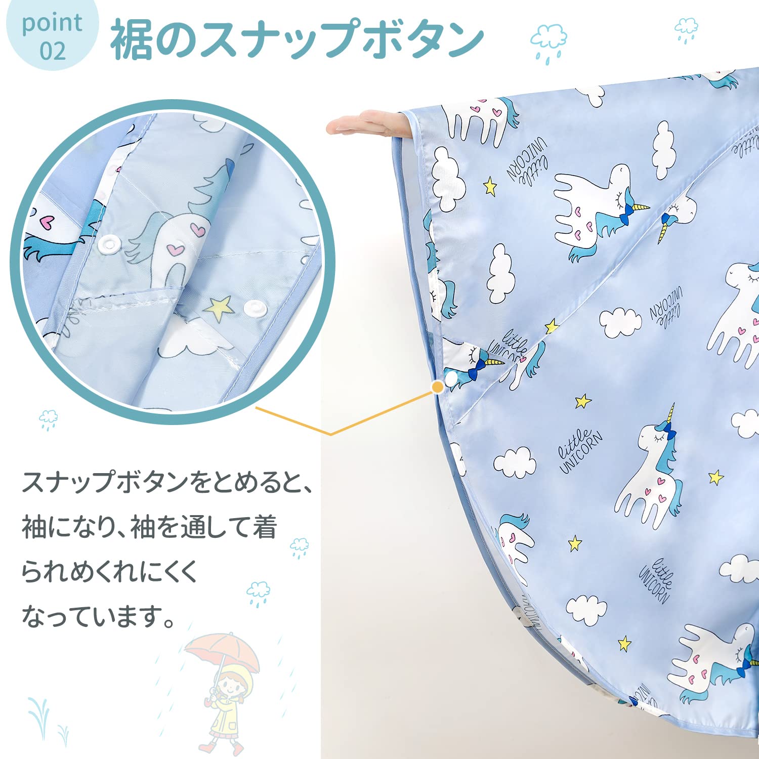 【着脱も楽チン】すっぽり簡単に着脱できて便利なポンチョタイプ!ゆったりと着用できるので、ランドセルの上からでも着用可能。通園・通学からアウトドアまでさまざまなシーンで大活躍!また、裾にあるボタンスナップをとめると、袖になり、袖を通して着られます。