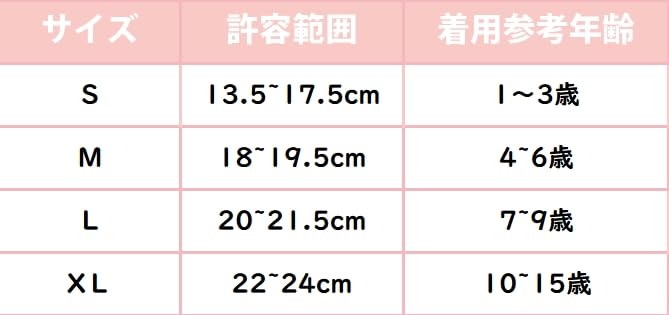 【サイズ】S(1〜3歳/13.5~17.5cm)、M(4〜6歳/18〜19.5cm)、L(7〜9歳/20〜21.5cm)、XL(10〜15歳/22〜24cm)