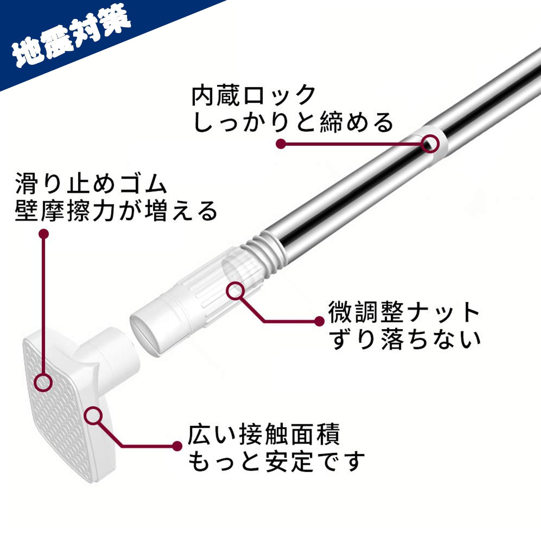 ?【転倒防止グッズ】: パイプ材質:304ステンレス。パイプ径:32mm。両端圧着板:ABS樹脂。取付高さ:50 to 80cm、70 to 120cm、90 to 160cm、110 to 200cm。防水・防湿、耐食性。地震が発生した場合、当社の家具転倒防止 突っ張り棒で家具をしっかりと固定します。