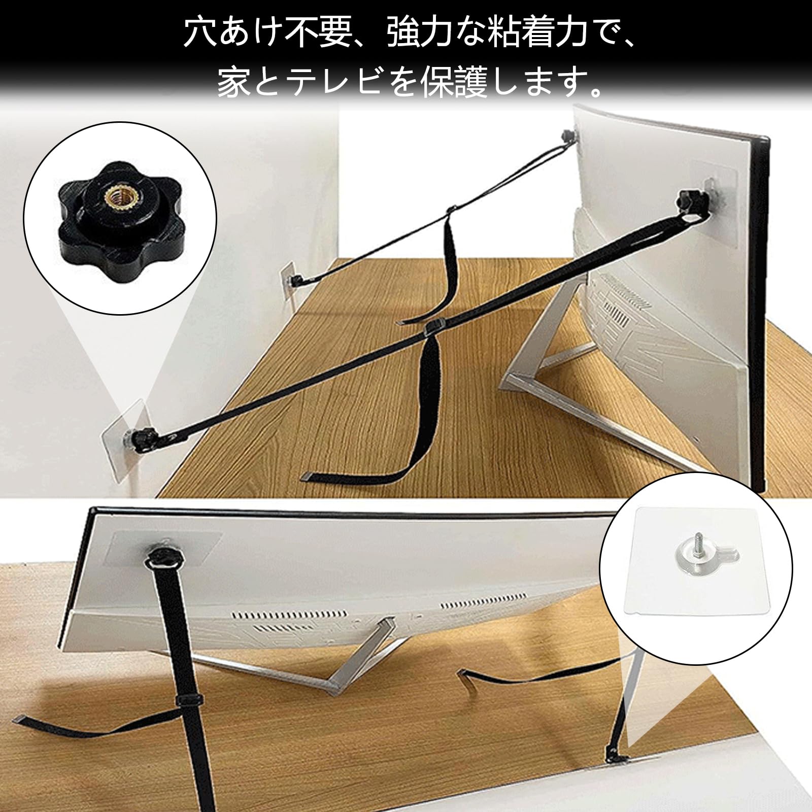 【製品パラメータ】このテレビ 転倒防止のセット内容は: テレビ 転倒防止ストラップ2本、テレビ 転倒防止粘着ネジ4本、テレビ 転倒防止サムナット4個。安定感抜群で、揺れや振動を吸収する効果もありますテレビ転倒防止グッズ。
