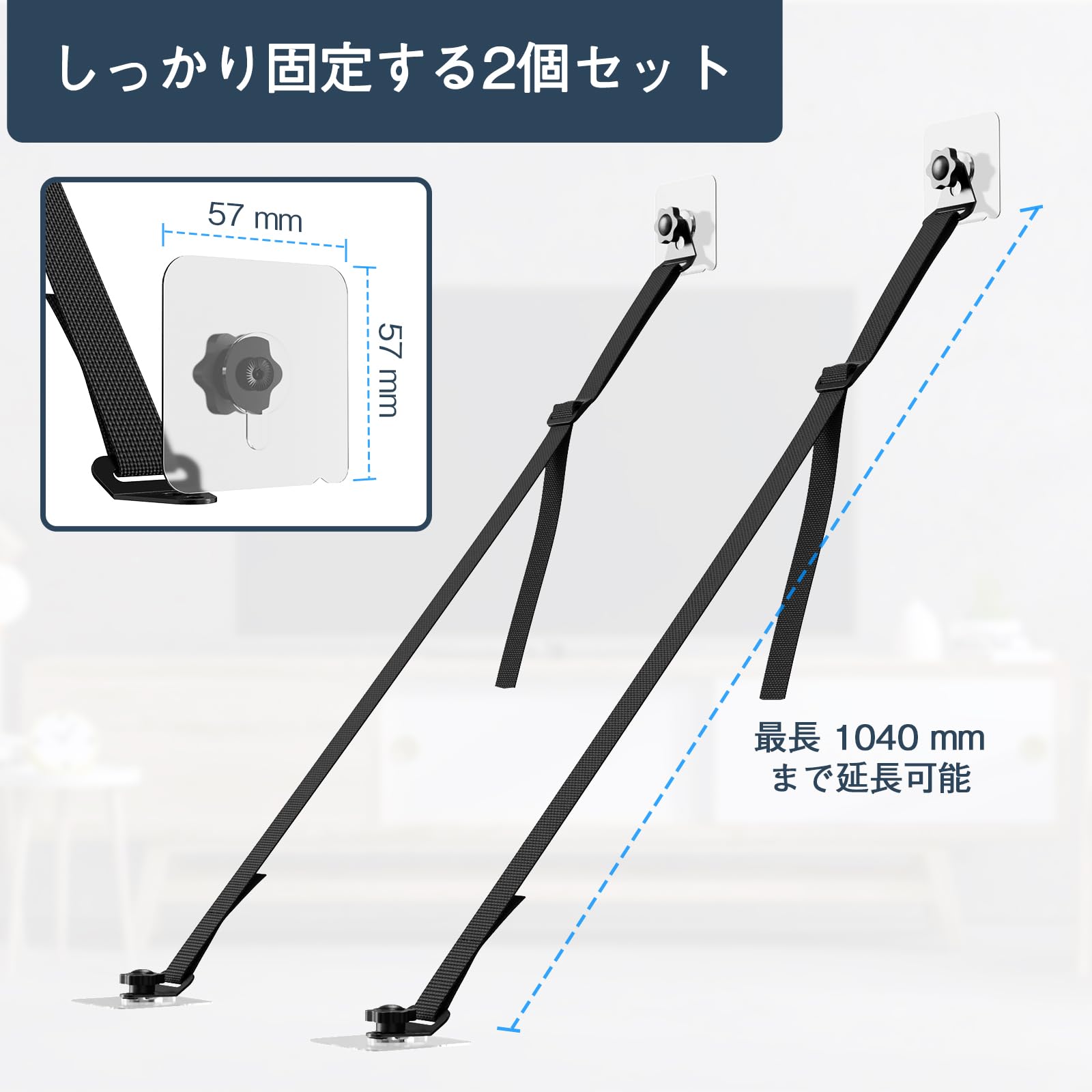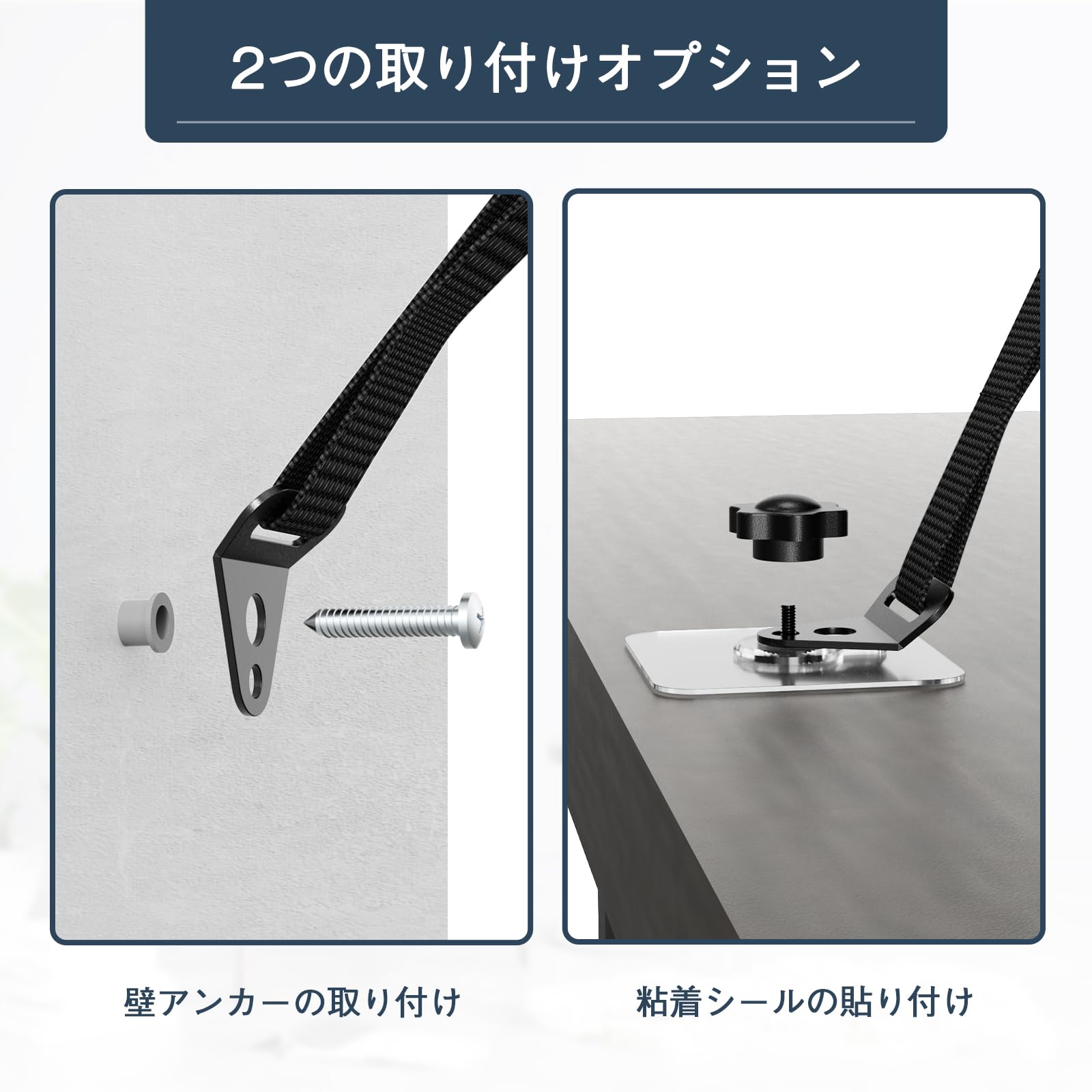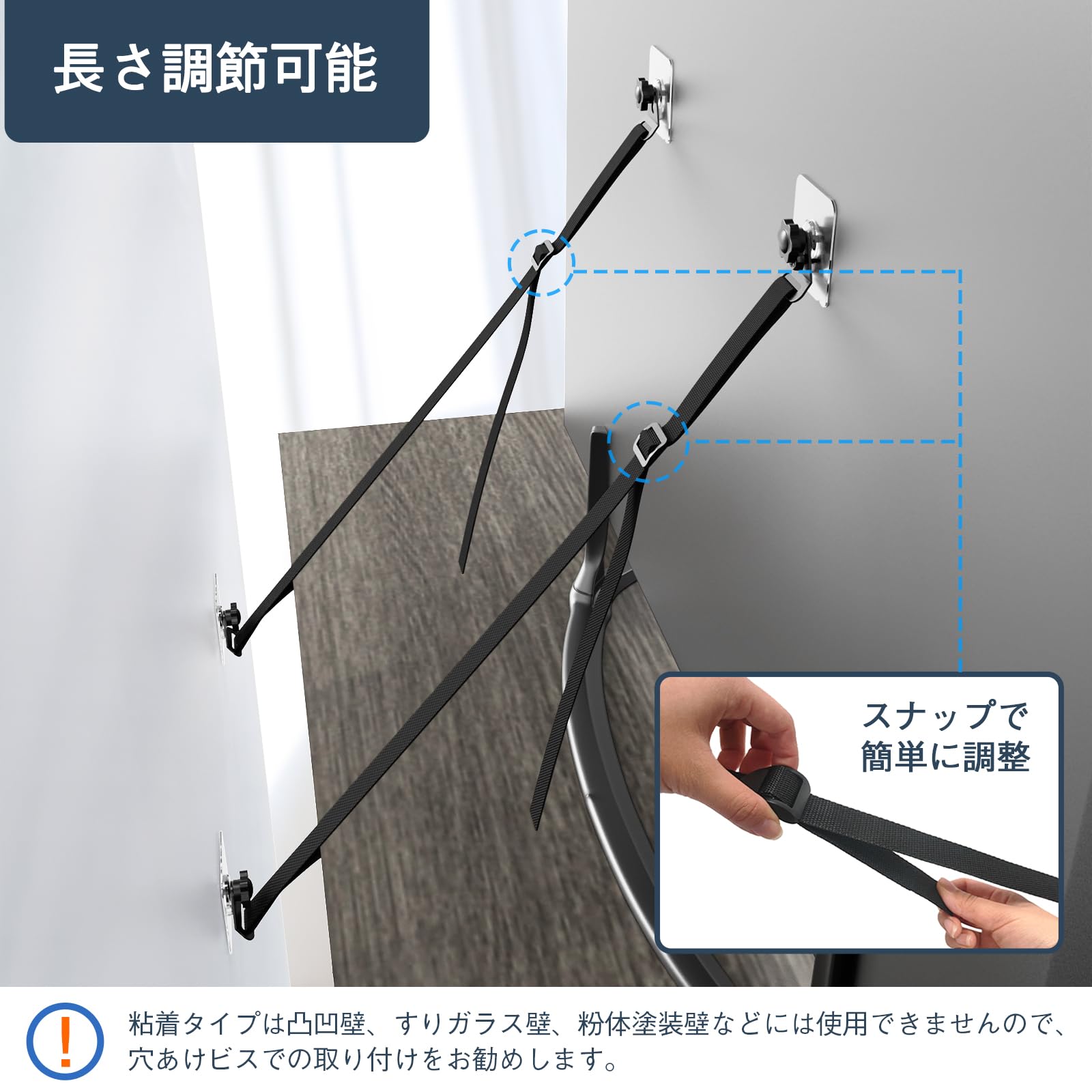 【2つの取り付けオプション】 転倒防止ベルトは壁掛けと粘着どめタイプ取り付けからお選びいただけます。*注:①粘着を安定させるため、設置後72時間は動かさないようにしてください。②粘着シールは貼付け後、剥がすと粘着効果が落ちますのでご注意ください。