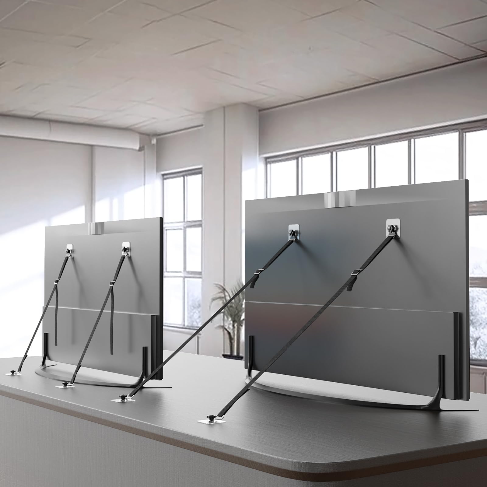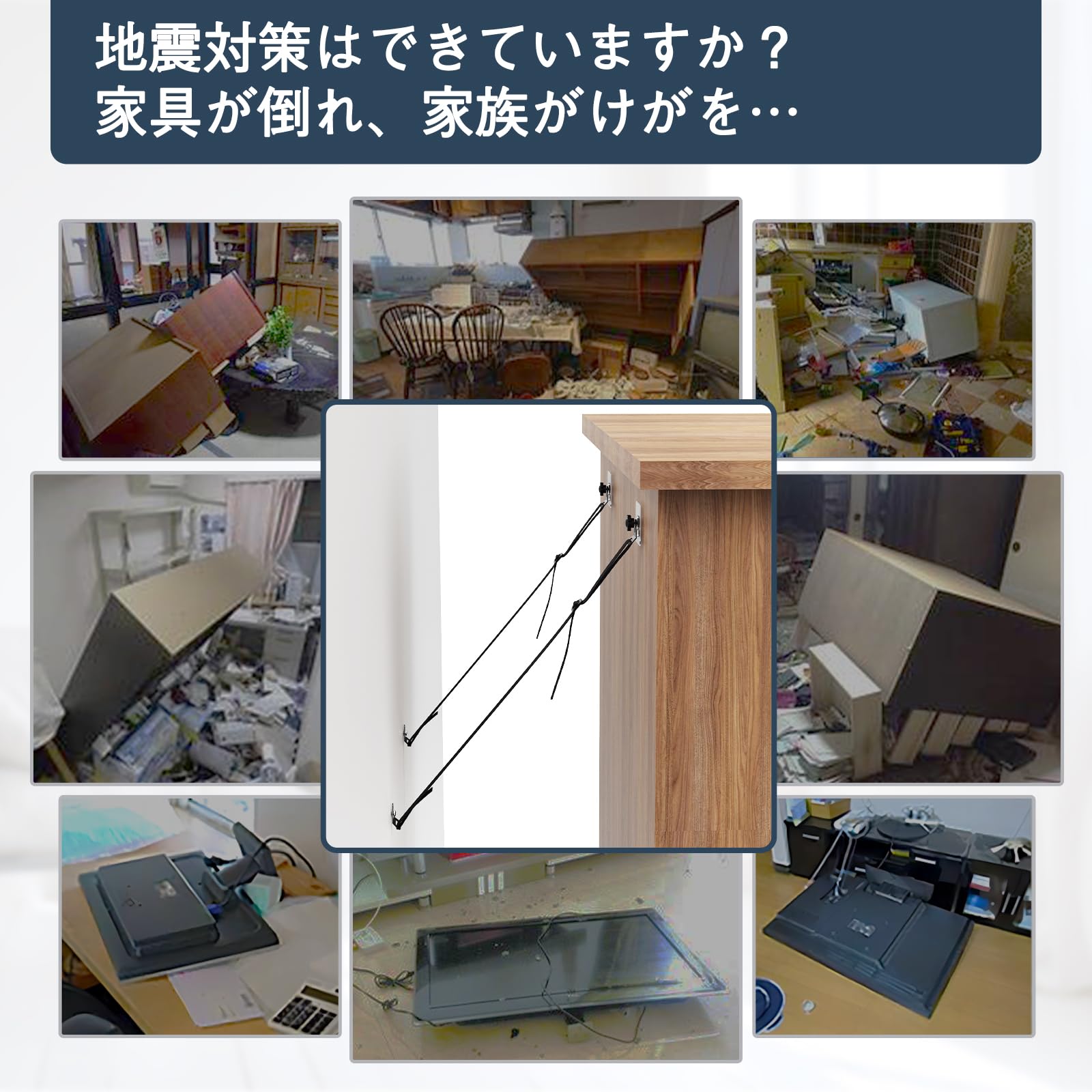 【転倒防止】テレビの背面に直接貼り付けたり、テレビ背面のVESA穴(壁掛け用ネジ穴)を利用して、テレビや家具の前方への転倒を防止する”粘着どめタイプ/ネジどめタイプの耐震ベルトです。 緊急時に子供やペットを守ります。