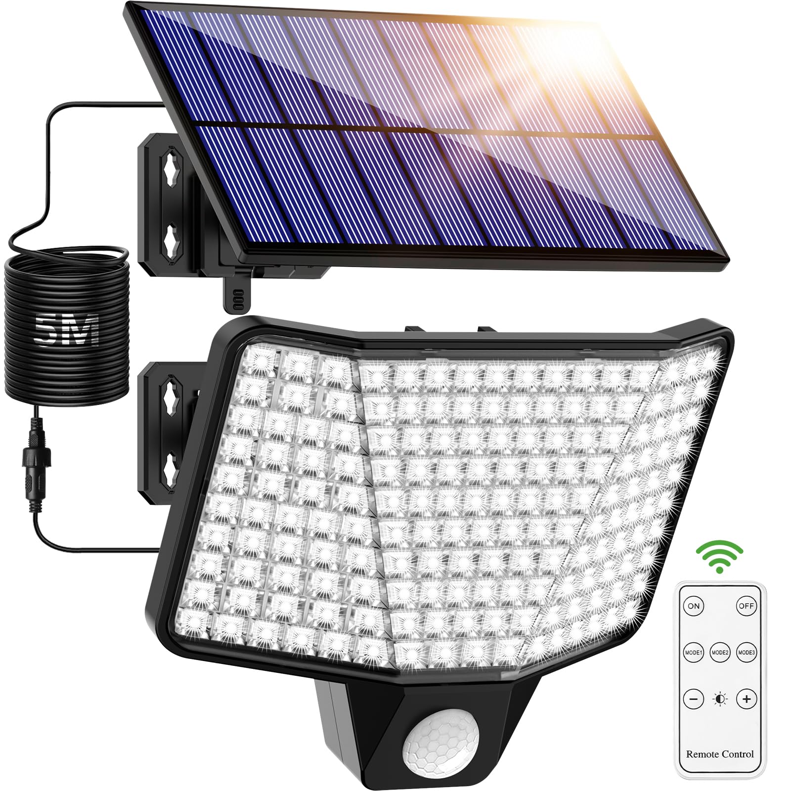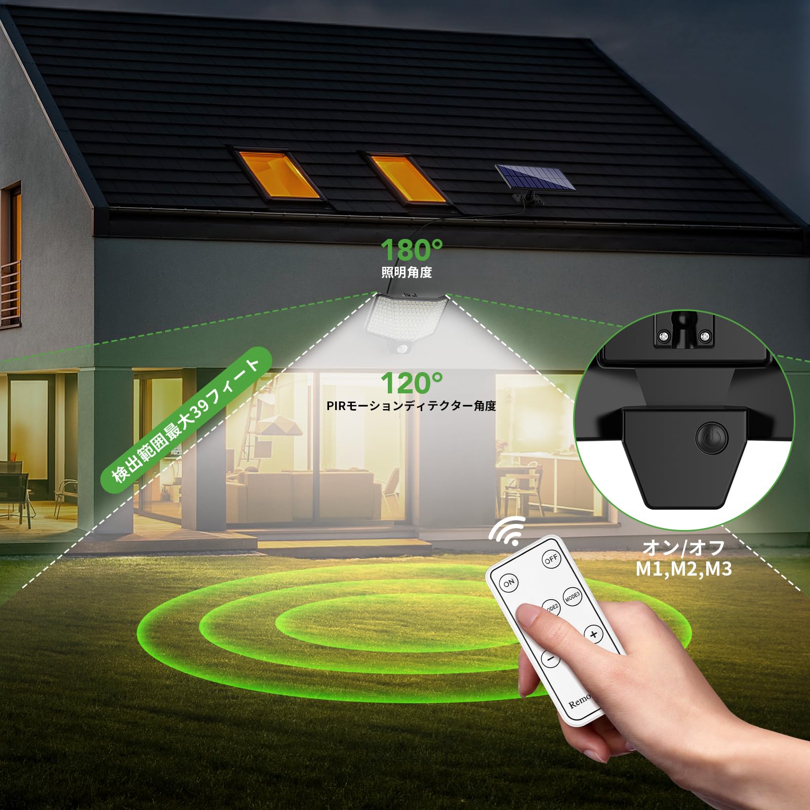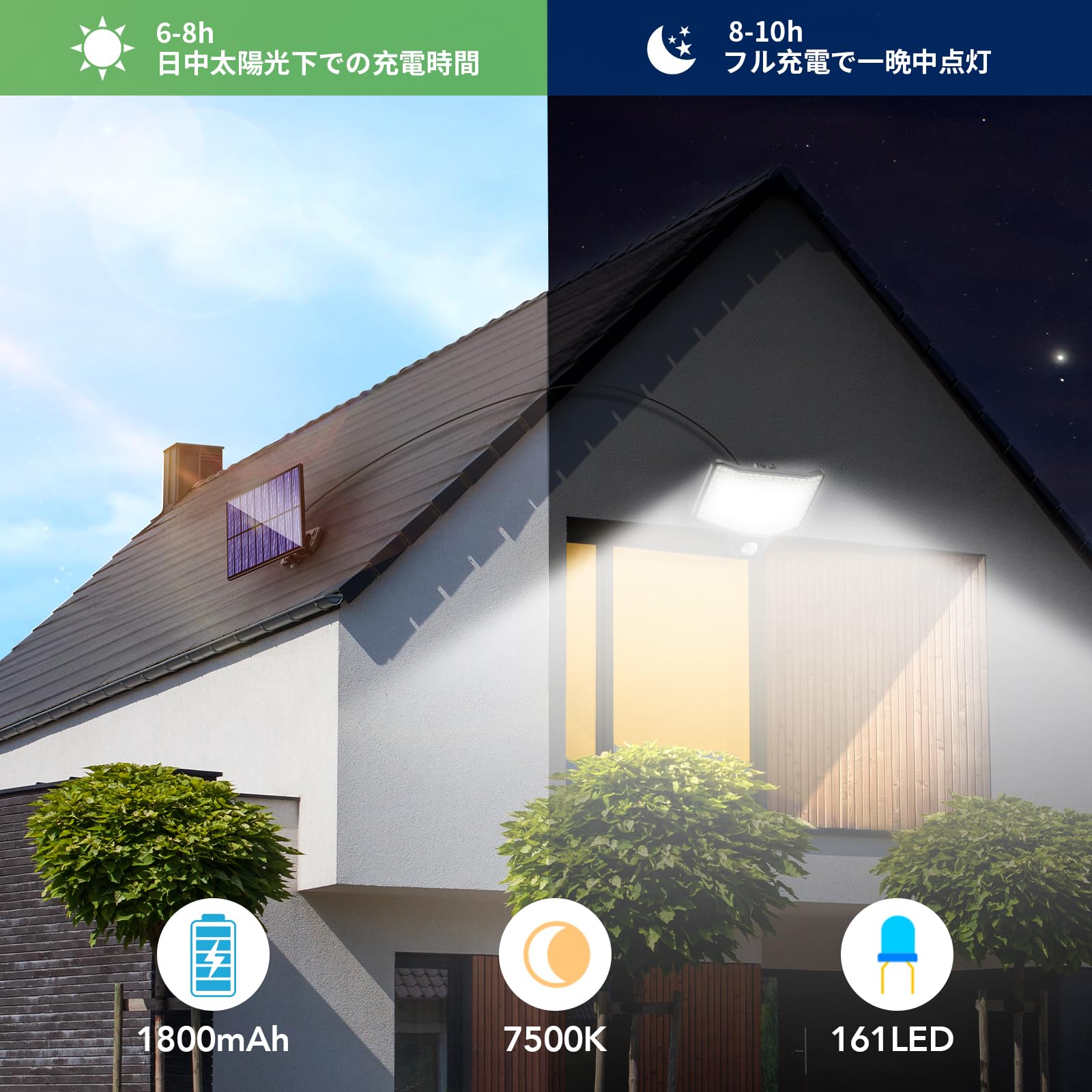161 LED ソーラーライトセンサーライト屋外 【3つ知能モード】IP65防水 1800mAh 光束最大2000ルーメン 超高輝度 防犯 リモコン付き 壁掛け式 ウォールライト 太陽光発電 電気代不要 人感センサー自動点灯 ガーデン 5Mケーブル /駐車場/玄関/廊下/軒先/庭先
