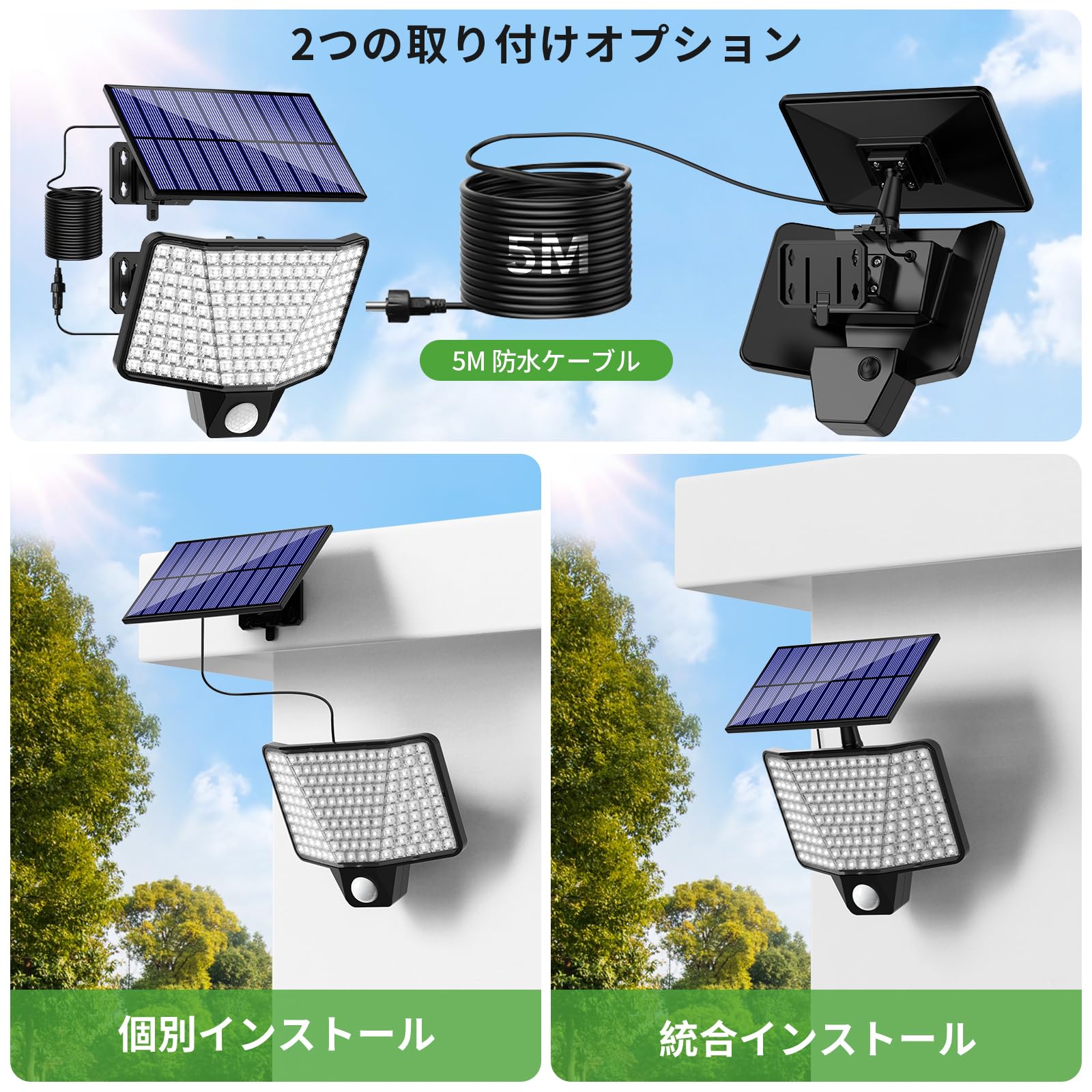 【2つの設置方法】ソーラーアウトドアライトは2つの設置方法-連結設置、一体設置が可能です。16.5Ft延長着脱ケーブル付き、取り付け簡単、付属のネジでソーラーランプを壁に取り付け、ソーラー充電パネルを日当たりの良い場所に設置できます。理想的な取り付け高さは約1.8〜2.5mです。