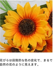 【本物の花の質感】:黄色いひまわりの造花は明るくて生き生きとした生命力がありそうです。造花の花びらは段階的な色の変化で、濃い黄色から薄い黄色へと変化し、まるで自然の花のように見えます。そして、葉のテクスチャは本物と同じようにはっきりと見えます。
