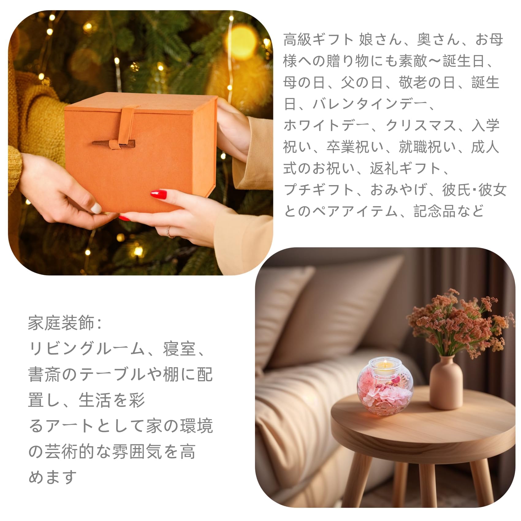 プリザーブドフラワー キャンドルホルダー 本製品は厳選された高品質なガラス素材を使用し、卓越した技術で自然の美とアートデザインを完璧に融合させた永生花キャンドルホルダーです。すべての永生花は特別な加工を施し、花の色と形を保ち、鮮やかさを長期間維持します。高級ギフトボックス付きで、バックルは木製の骨針でできており、高級感があり、しっかりとしている。 親しい友人や家族への贈り物に最適です。人気のギフト 永遠に枯れる贈り物 贈り物としてはもちろん、お家での飾りとしても最適