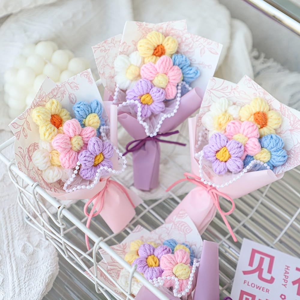 「 手作り感満載のかわいらしいデザイン」:丁寧に編まれた可愛らしい小さな花束です。編み目の細かさと手作り感が、受け取る人に温かさと特別感を与えます。見た目は美しくてかわいいし、枯れずに永遠に楽しめます。
