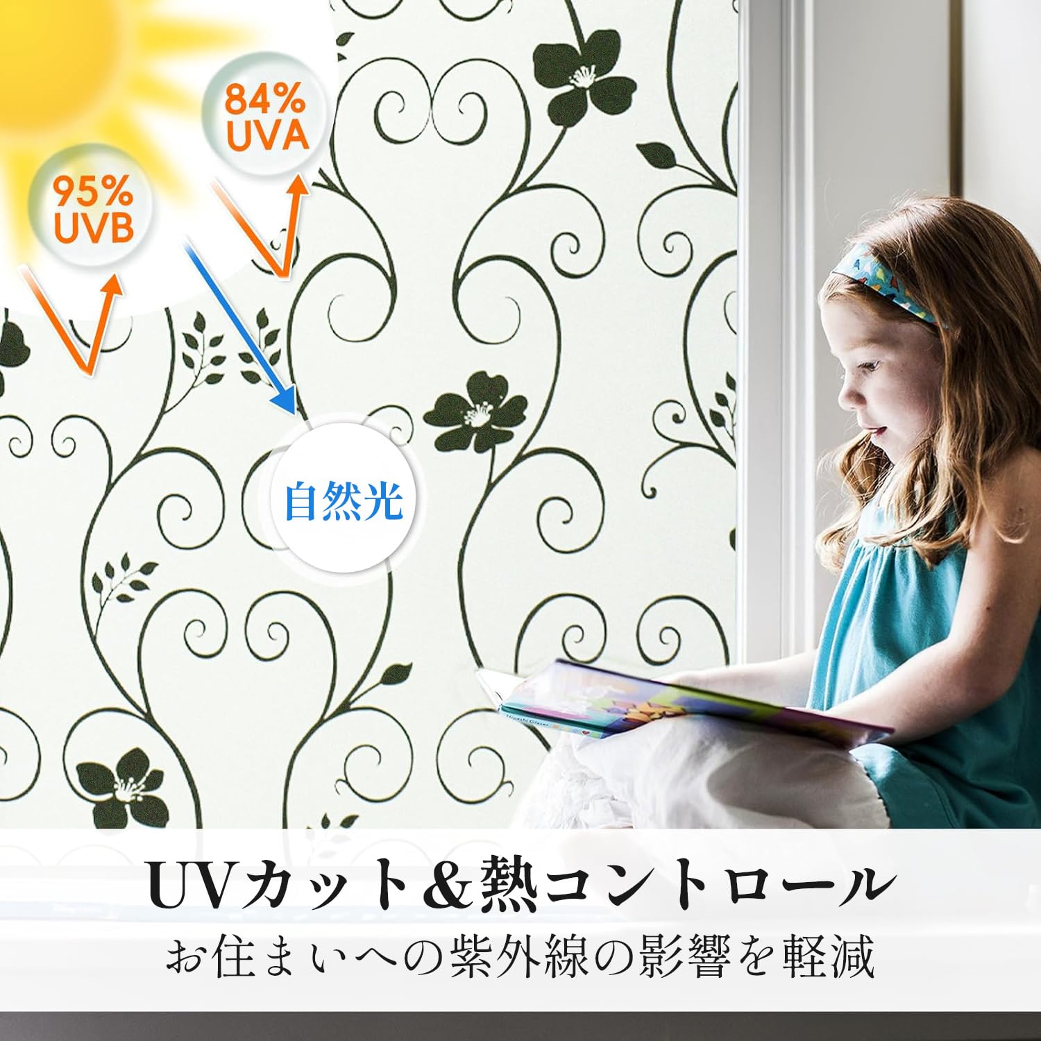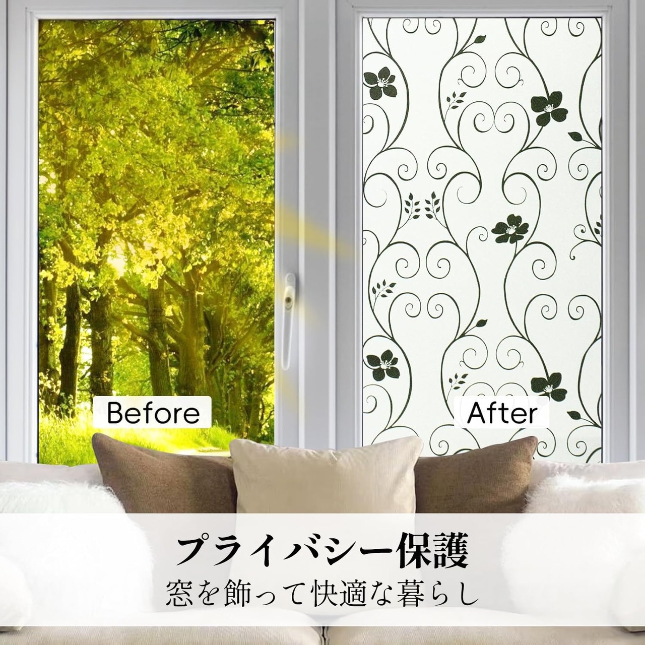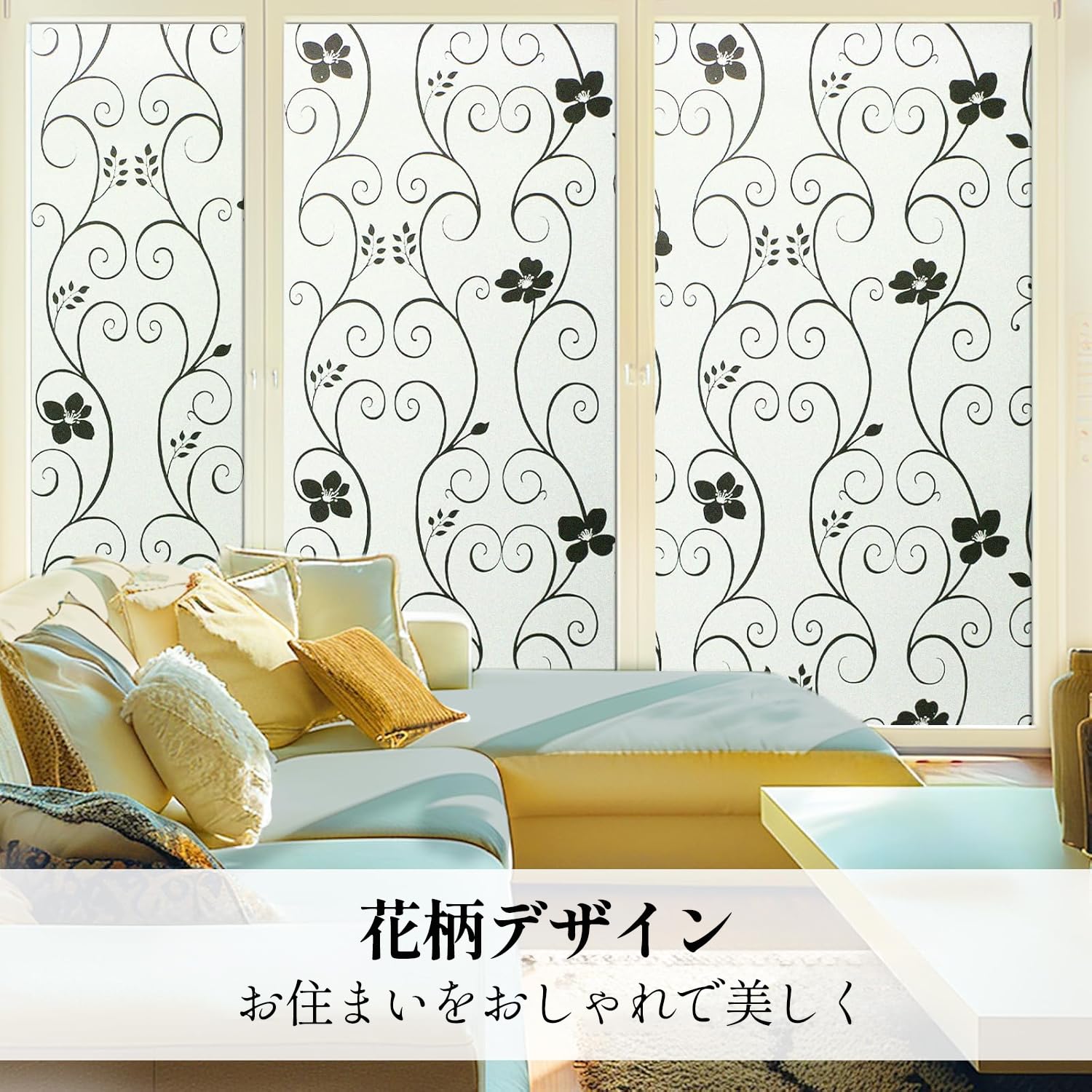 【目隠し、プライバシー保護】⇒ 外からの視線を遮りながら、かつ、充分に外の光を室内に取り込めます。カーテンを閉めているときの閉塞感や窮屈感あるの暗い部屋から解放されるでしょう。透明窓ガラスを簡単に装飾ガラスに変身。部屋に花が咲いたようです。目隠し効果は高いです。