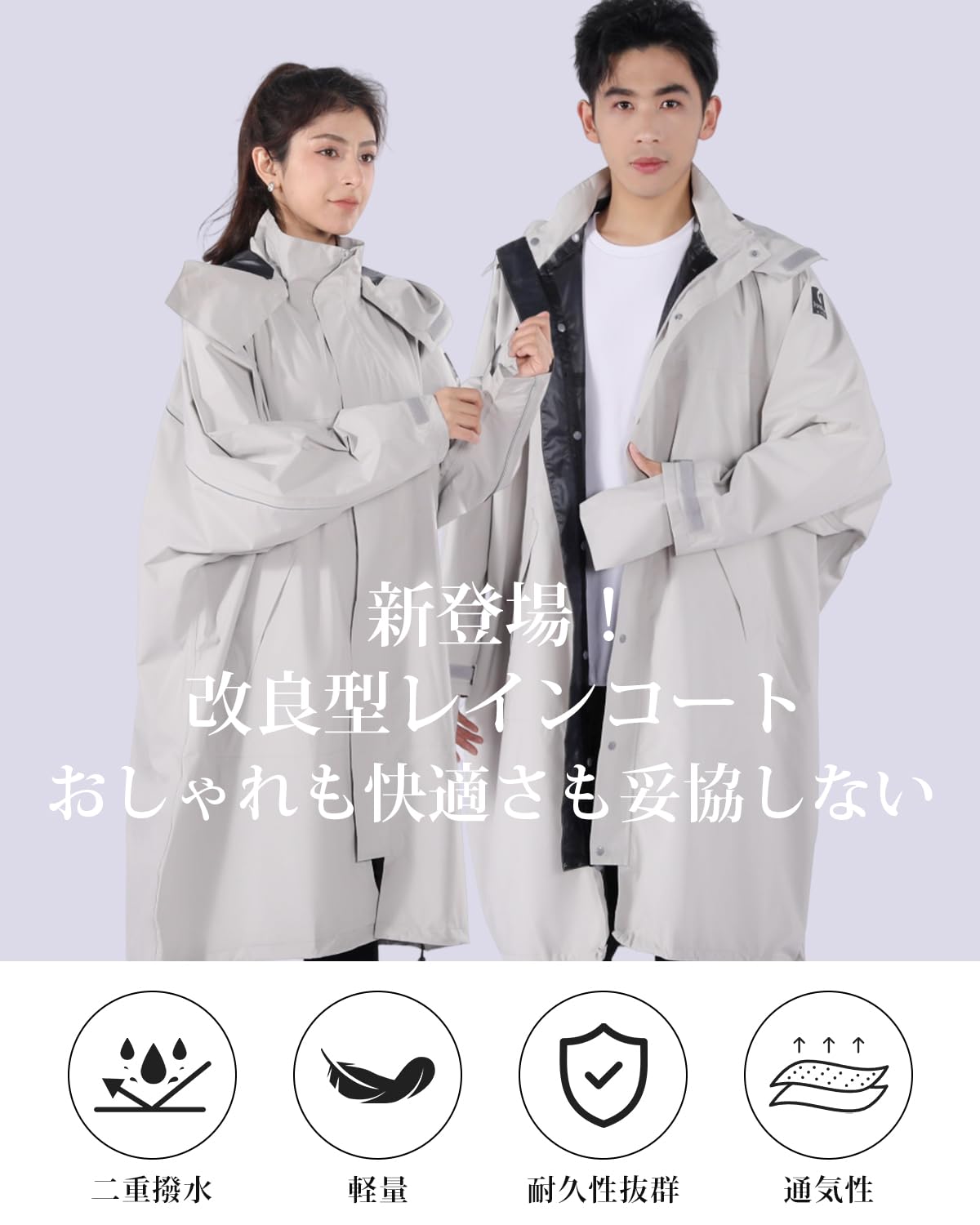 3つの特徴: ? 新開発の高品質な春亜紡素材とTPUコーティング技術が、あなたのお出かけ体験をさらに快適に!耐水圧 10,000mmの優れた防水・防風性能で、突然の雨や強風も気にせずアクティブに!透湿性 10,000g/m2/24hで汗や湿気を素早く逃がし、いつでもサラッと快適な着心地をキープ!?レインコートの裾には実用的なデザインを取り入れ、ライディング中に裾がめくれ上がるのを防ぎ、パンツが濡れる心配を軽減します。?着脱可能なフードと透明バイザーが顔をしっかり守り、優れた防雨性能を提供します。頭にぴったりフィットし、ヘルメットを着用していても快適に動かすことができます。