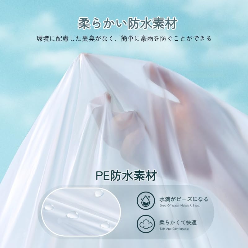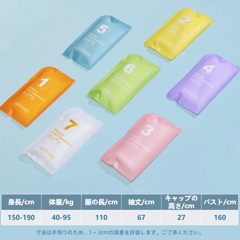 【商品仕様】 パッケージ内容:7枚セット サイズ:フリーサイズ(男女兼用)着丈:約160cm 身幅:約110cm袖丈:約 67cm 推奨身長:150~190cm 重量:約40g(1枚)色:7色 素材:防水性PE素材