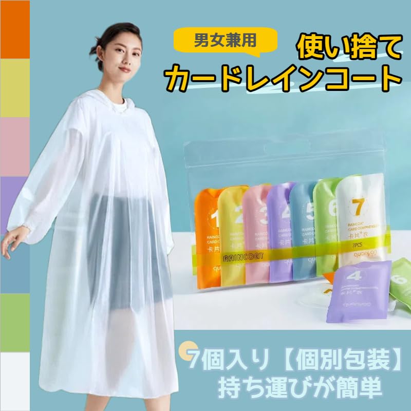 [WhaRainle] 【2025年のNEWスタイル】レインコート 使い捨て 7枚入り レインポンチョ 防災グッズ 学生用 通勤 通学 自転車 旅行 水上項目 スポッツ観戦 梅雨対策 リュック対応 ミニ包装 持ち運び便利 フリーサイズ 男女兼用 レインウェア