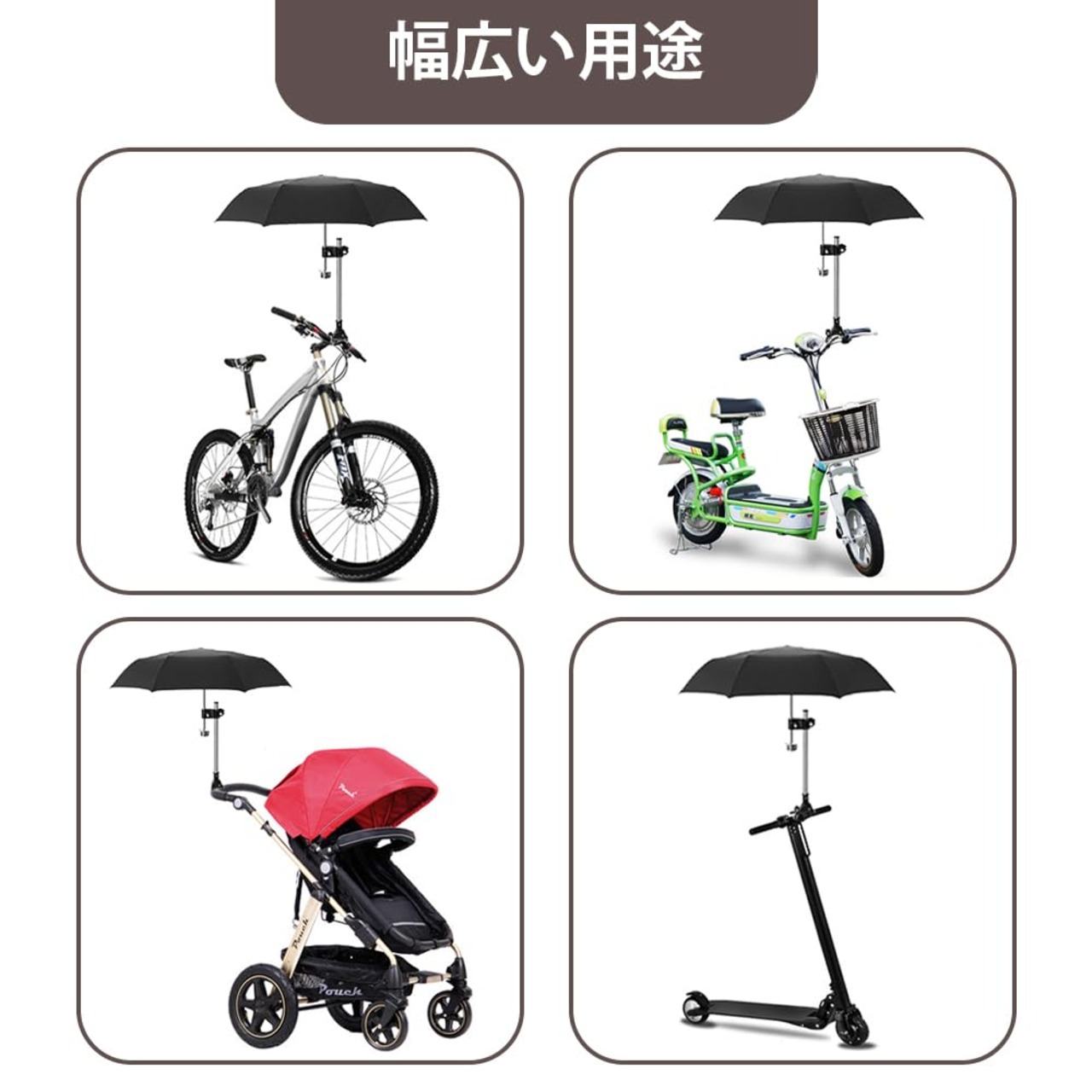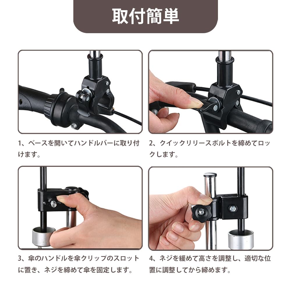 【幅広い用途】自転車や車椅子、ベビーカーなど幅広いハンドルに取り付け可能。雨の日には傘を固定し、晴れた日にはUVカットにも活用可能。アウトドアやサイクリングなど様々なシーンで快適に使用可能。