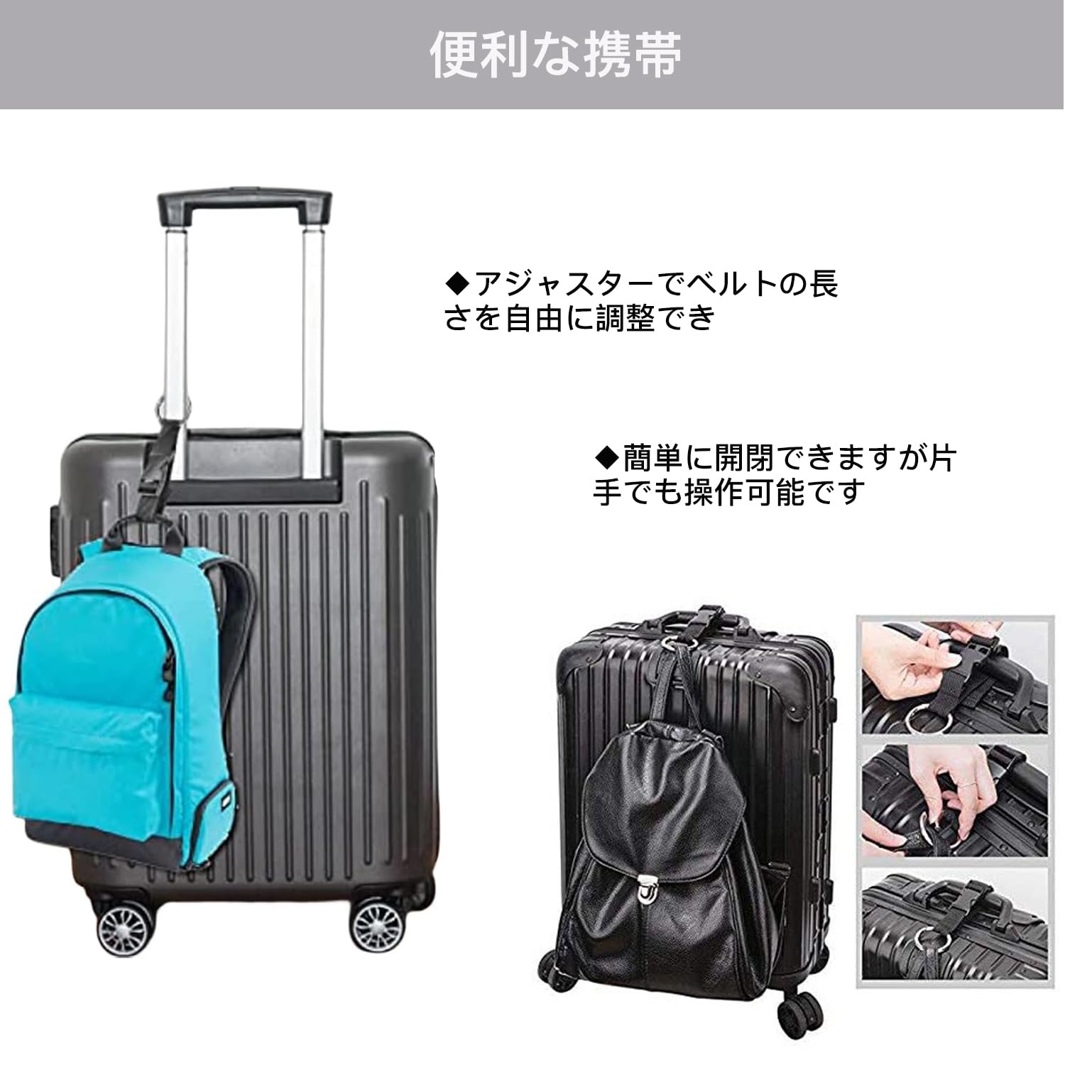 【用途】出張また旅に出る時、季節の変わり目に、邪魔になりがちなジャケットやマフラーなどをスーツケースまたバッグに取り付けて持ち運べます。