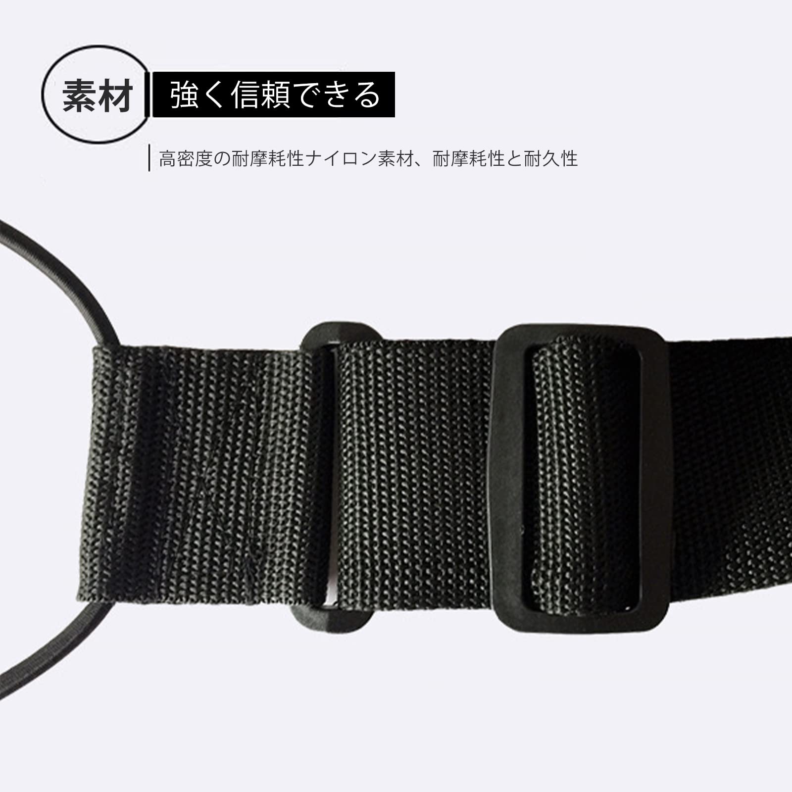 【サイズ】 [幅]5 CM、ゴム部:[直径]12 CM、[ベルト部長さ]26〜40CM(の間で調整可能)、[ゴム部込みの全長]50〜64 CM。金具などがなく、バッグや荷物を傷つけることもありません。