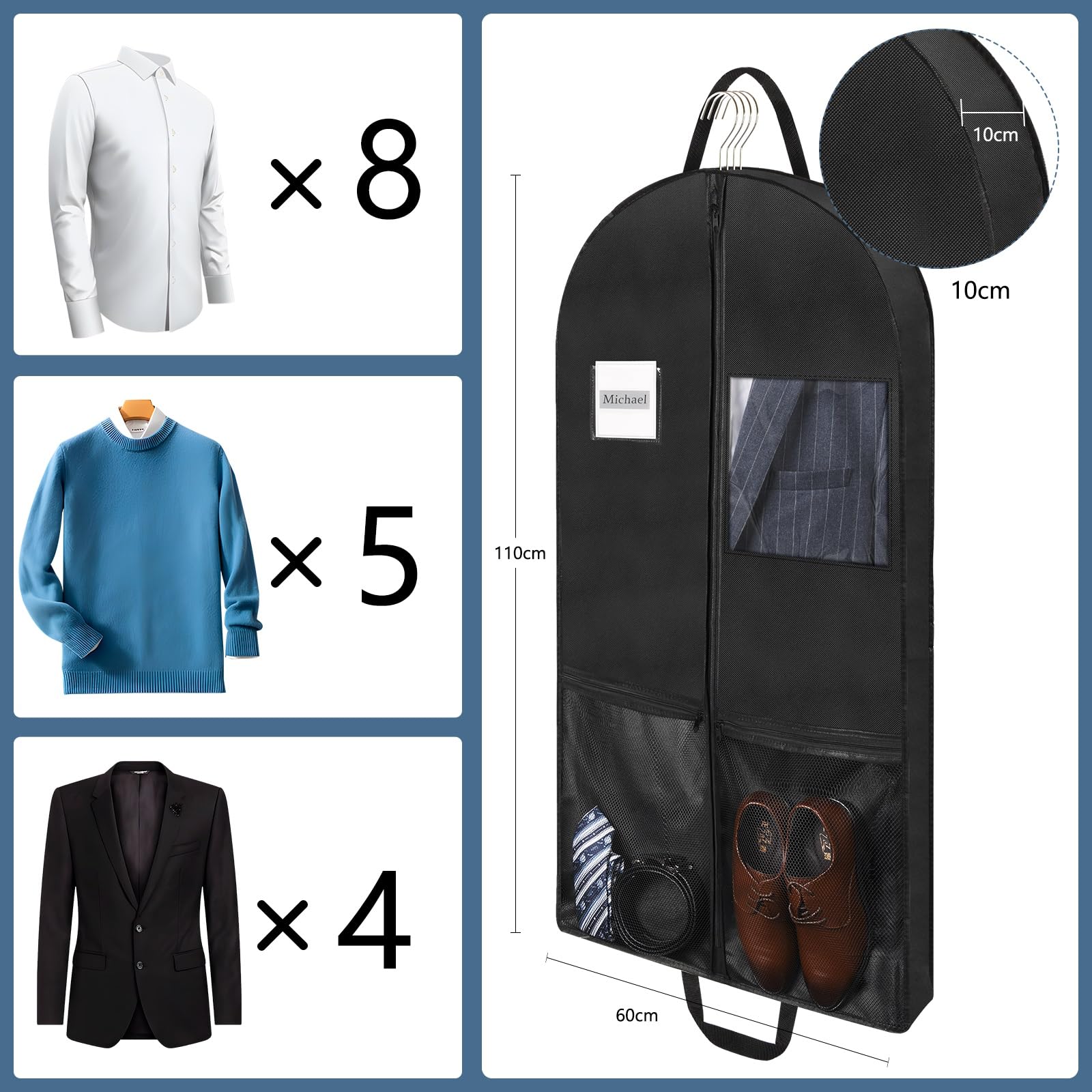 【大容量】10cmのマチ付き、シャツ5枚またはジャケット2枚を収納することができます。さらに、靴やネクタイなどを収納するため、ガーメントバッグは2つのポケットもあります。