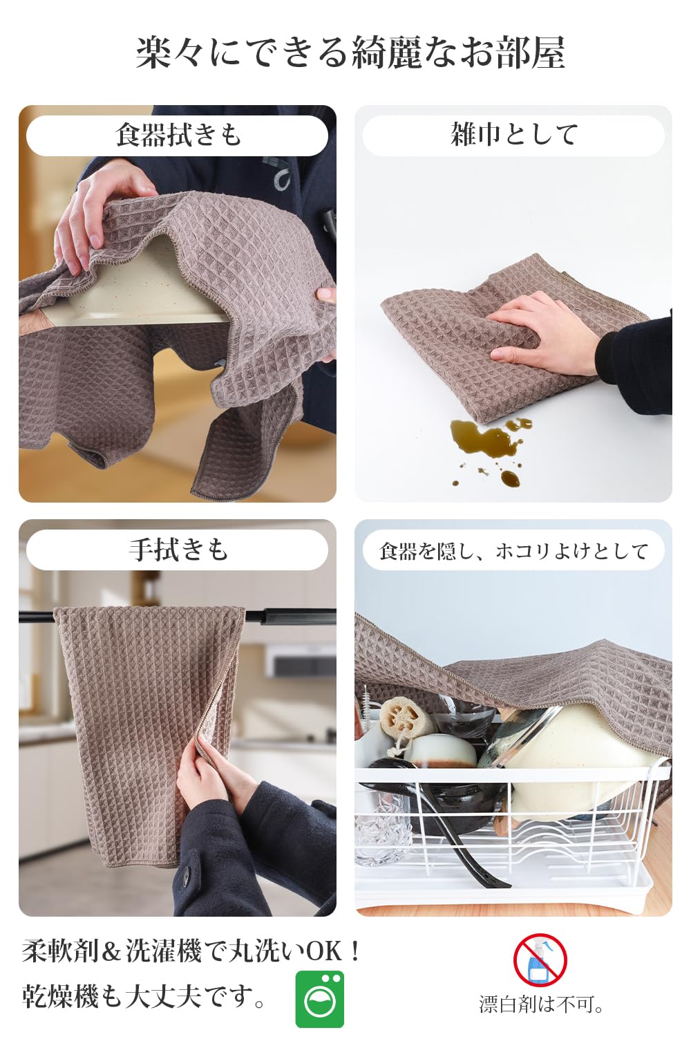【食器拭きだけでなく、水切りかごの代わりにも】シンク周りの空間が最大限に節約できるような水切りを目指して、水切りタオルがやっと誕生しました。即、洗濯できて、水切りカゴのように定期的な掃除をしなくてもいいし、それに、キッチンの場所も取らないし、キッチンのスペースもかなり広くなれる吸水水切りふきんです。