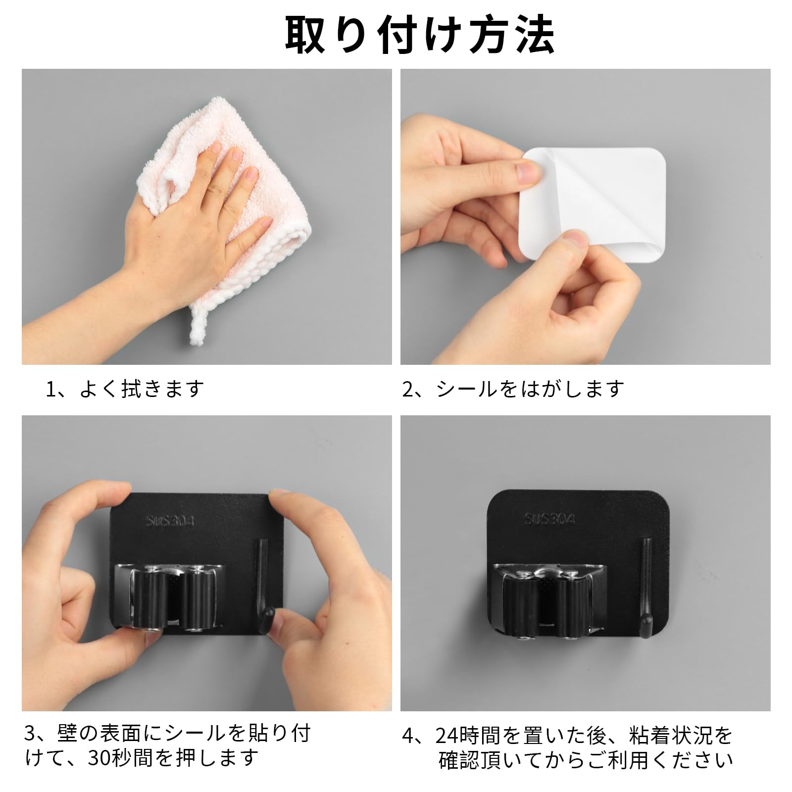 ?【商品の仕様】パッケージ内容:黒モップホルダー×4個セット入り+強力粘着テープ×4個;サイズ:長さ8cm*幅6.5cm*高さ3.7cm;カラー:ブラック ;材質:SUS304ステンレス製;適用範囲:直径19?25mm。取付用の粘着テープもセットで入っており、開封してすぐに設置できます。