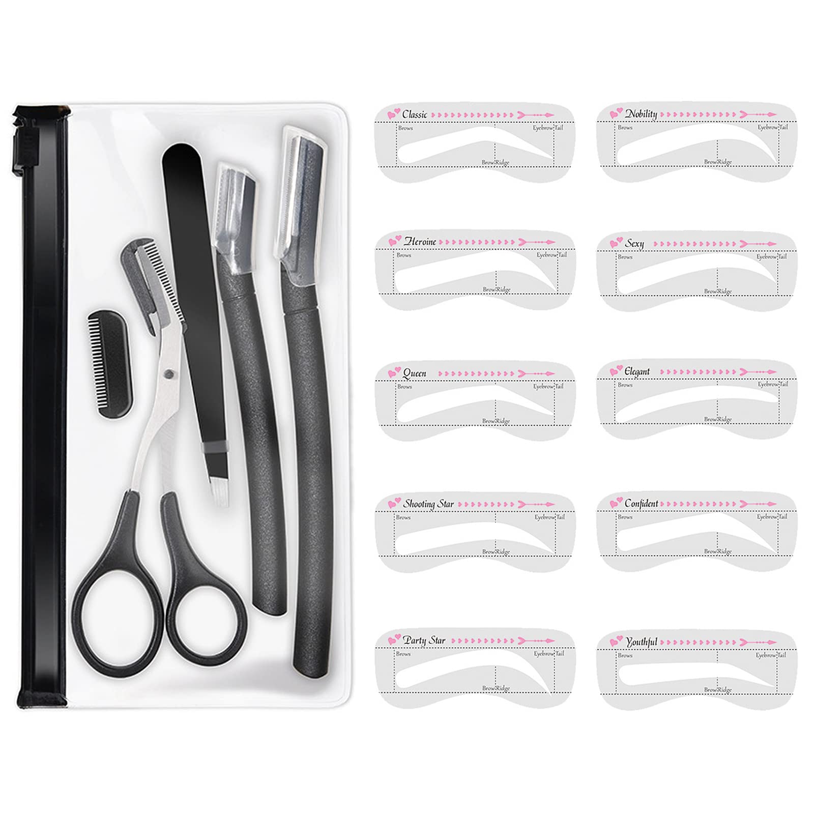セット内容:毛抜き、コーム付きまゆげ用ハサミ、ガード付きカミソリ(小)、ガード付きカミソリ(大)、まゆ毛用テンプレート(10種類)、収納袋付き。