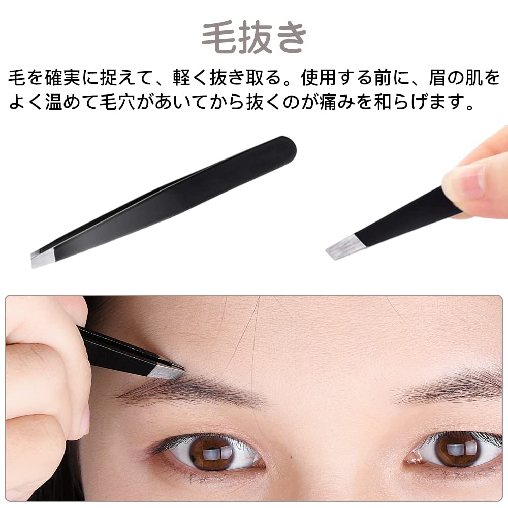 毛抜き:毛を確実に捉えて、軽く抜き取る。使用する前に、眉の肌をよく温めて毛穴があいてから抜くのが痛みを和らげます。